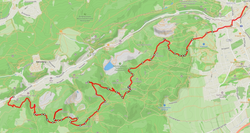 Die Forstwege waren teilweise schneebedeckt, teilweise ordentlich vereist. Ohne Spikes wäre es gegangen, angenehmer war es mit. Bei Blankeis stieß ich mit den Trailrunningspikes (Stifte, keine Zacken) aber an die Grenzen. Bei diesen Verhältnissen besser richtige Zacken, die sich fest ins Eis krallen können.