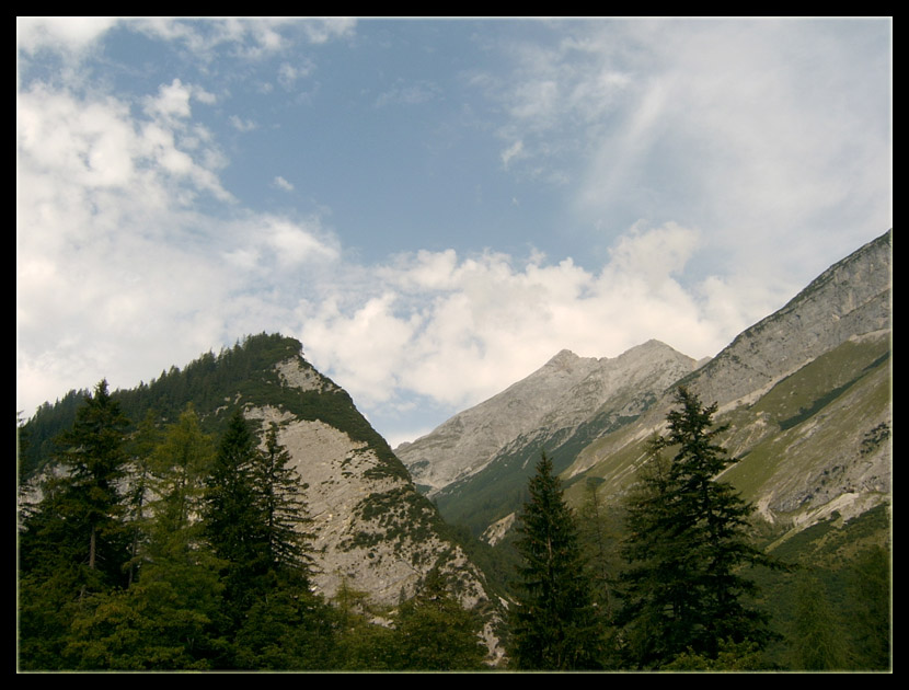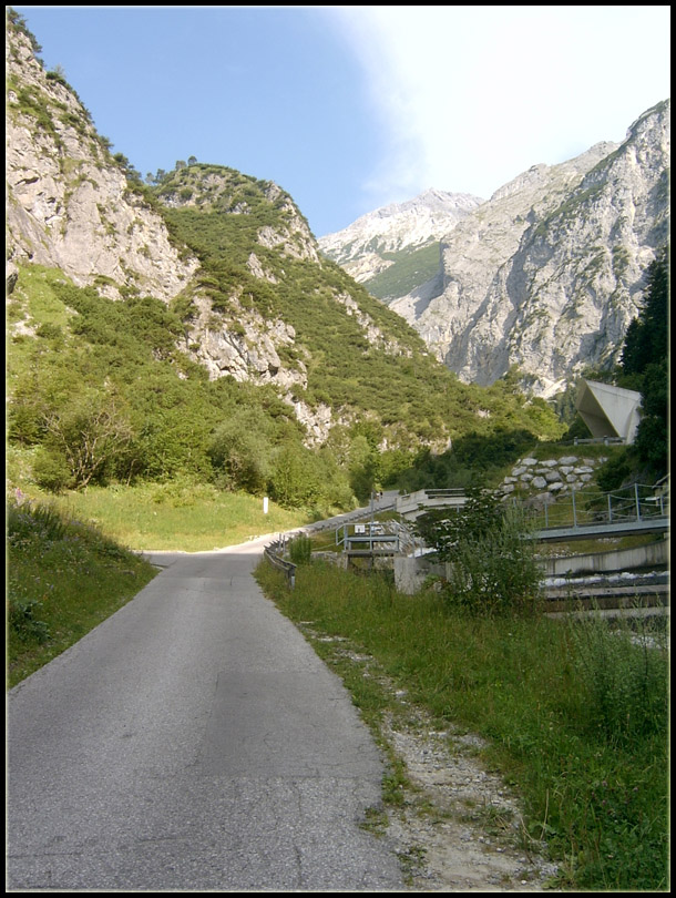 Mit dem Rad ging es dann den Inn entlang bis zum Rundgemälde und dann über die Brücke links Richtung Mühlau. Nach einem kurzen Anstieg ist man schnell in Arzl und Rum. Ich bin auf der Landstraße gefahren, was wegen des vielen Verkehrs etwas unangenehm ist. Es gibt die ganze Strecke durch auch Schleichwege, die man als nicht Ortskundiger aber nicht sofort findet, da nicht als Radweg ausgewiesen. Wie dem auch sei. In Thaur bog ich Richtung Ortskern ab, wo es mäßig steil zur Kaponssiedlung geht. Von dort hat man von einer Anhöhe aus einen prächtigen Blick über das Inntal bis ins Wipp- und Stubaital sowie den Gletschern am Talende. Nach einer kurzen Rast nahm ich die alte Landstraße zwischen Thaur und Absam am Waldrand entlang. Hier musste ich wegen einzelnen einheimischen Rasern ziemlich aufpassen, aber das gilt überall im Innsbrucker Land und wohl überall auf der Welt. In Absam angekommen ist das Halltal ausgeschildert (als Mautstraße), bei der man recht steil bis zu einem Parkplatz fahren kann. Mountainbiker mit besserer Übersetzung und leichterem Material können bis zum Talschluss des Halltals (Issangerhütte) durchfahren. Allerdings ist die gesamte Strecke sehr steil, mit 25% im ersten Teil der Strecke und bis 32% im letzten Teil.