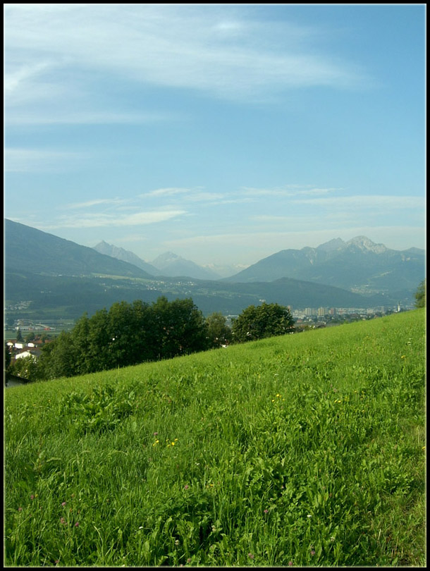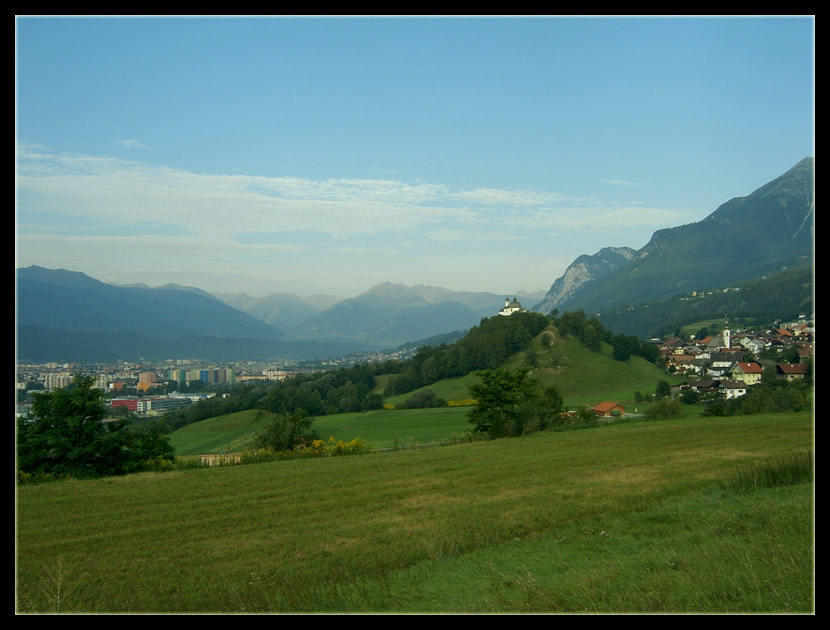Nach einer kleinen Jause auf St.Magdalena (1,90 für kleinen gespritzten Apfelsaft, 3,40 für ein leckeres Käsebrot) kehrte ich wegen Gewittervorboten am Himmel (Altocumulus castellanus) und zunehmenden feuchten Quellungen in den unteren Höhenschichten (Cu fra, Cu med ab Kammniveau), aber auch vermehrter Cirrusbewölkung um und rannte die Mautstraße hinab. Über einen weitläufigen Feldweg gelangte ich von Absam nach Thaur und fuhr dann die Hauptstraße zurück nach Innsbruck.