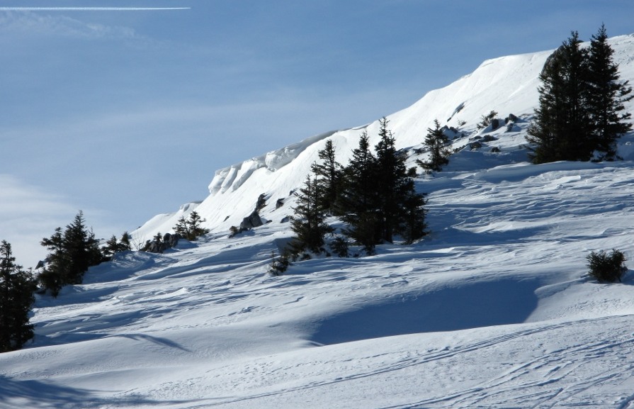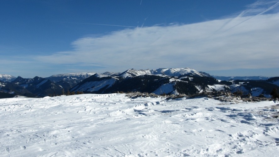 Nach dem Steilstück in leichtem Auf und Ab am langgestreckten Hochplateau zum Gipfel, mit unerwartet wenig Wind – offenbar Düseneffekt nur am Sattel, sodass ich in meiner viel zu dicken Zwiebelschicht schwitzte. Noch dazu hatte ich zu wenig zu trinken eingepackt. Im Gipfelbereich toste der Sturm, bildete kleine Schneeteufel und rauschte als Dichtestrom den Hang hinab. Feine Eiskristalle kitzelten im Gesicht. Am Kreuz war der Wind am stärksten, rund 100 km/h schätzte ich, er zerrte am Rucksack und erschwerte das Fotografieren. Die Wildalpe ist ebenso wie der Große Zellerhut ein stromlinienförmiger Berg und damit anfällig für hohe Windgeschwindigkeiten. In früheren Wintern ein Garant für viel Schnee, da im Nordweststau gelegen. Durch die Klimaerwärmung nimmt jedoch die Niederschlagsmenge weiter ab und damit hängt es nicht einmal an der Höhenlage, sondern es fehlt zunehmend schlicht der Tiefdruckeinfluss für Neuschnee.