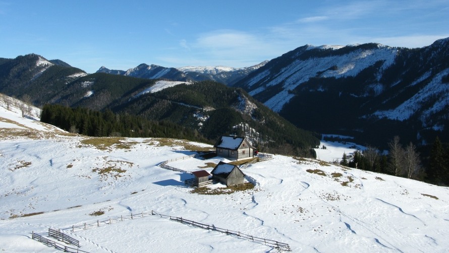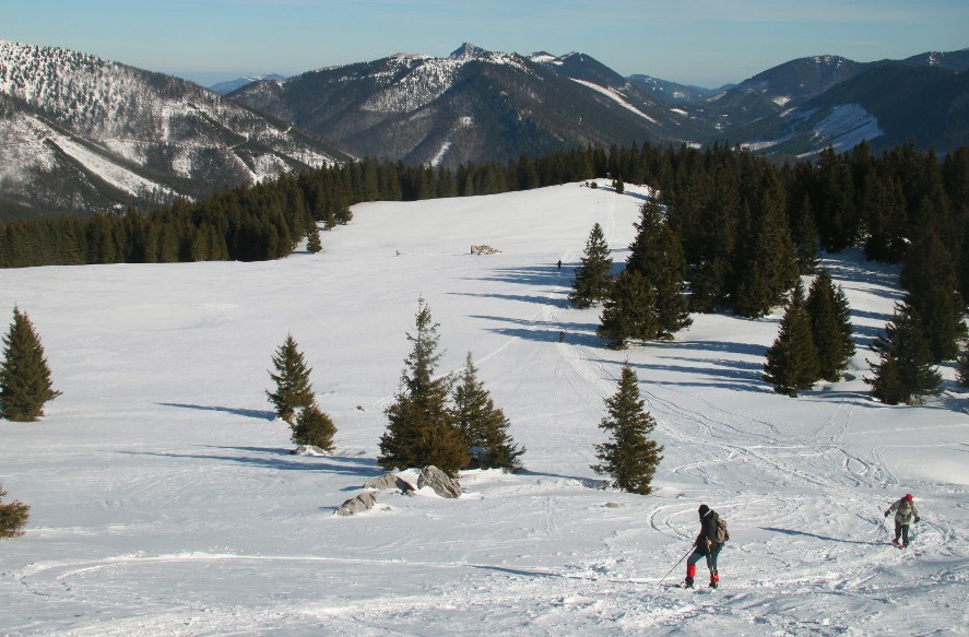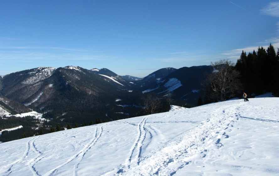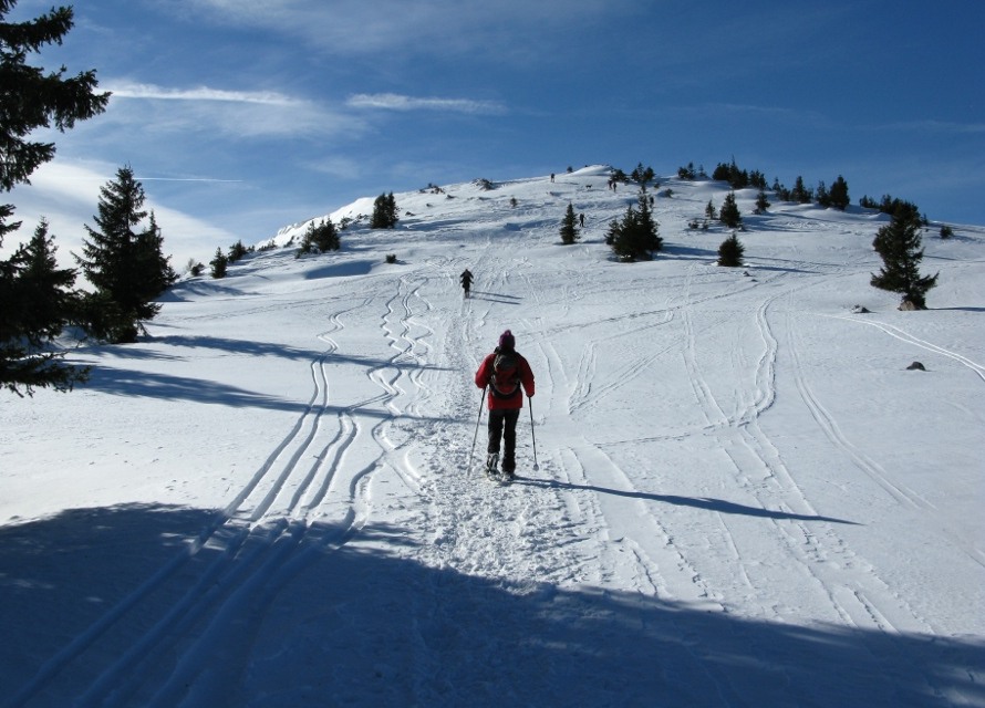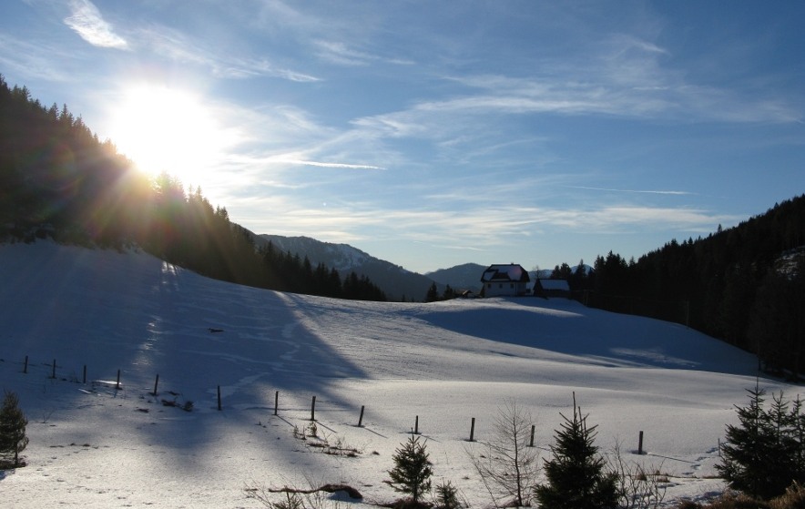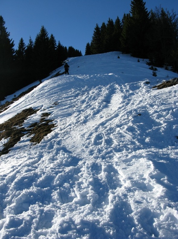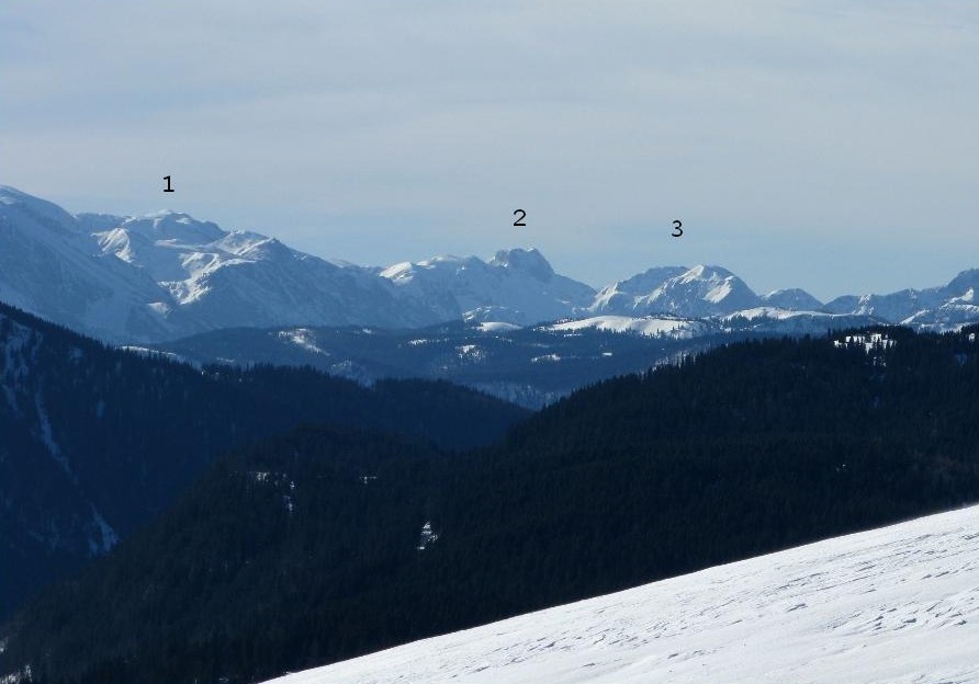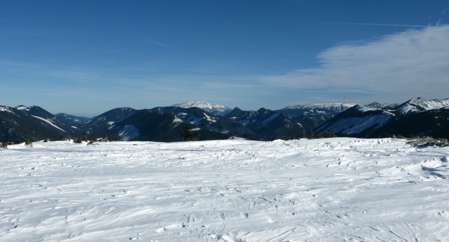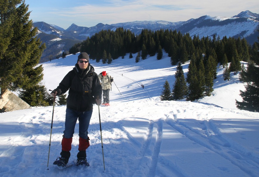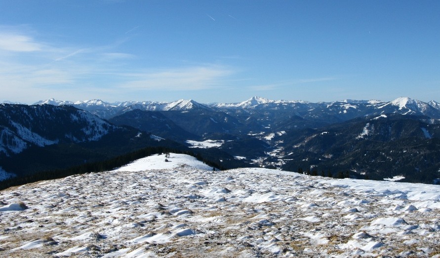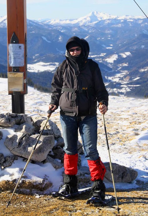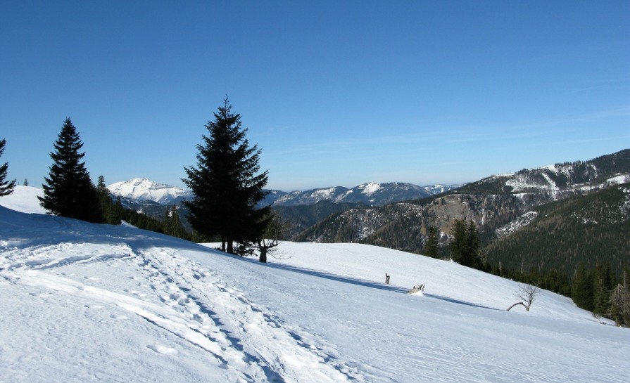 Das war meine erste Schneeschuhtour – damals eine gemeinsame Rudeltour mit Schneeschuhgehern und Skitourgehern. Die Schneeschuhe hatte ich von Martin geliehen, meiner Erinnerung nach bereits Tubbs, also mit recht guter Bindung. Der Start war recht spät, erst um 11 Uhr am Lahnsattel, dazu war es ziemlich mild mit föhnigem Westwind. Zunächst nach Süden um den Kriegskogel (1150m) herum und dann querend zur Sulzkam nach Südosten. Dort plagte ich mich bereits mit dem sulzigen Tiefschnee. Wir hatten durchwegs Sonnenschein mit wenigen hohen und mittelhohen Wolken. Bei der Sulzalm die Schlüsselpassage mit einem steilen Osthang, wo ich immer wieder stehen bleiben musste, weil mir dazu die Kondition fehlte – ich hatte die Tage davor durchgehend Dienst gehabt, dieser Tag war mein erster freier Tag.