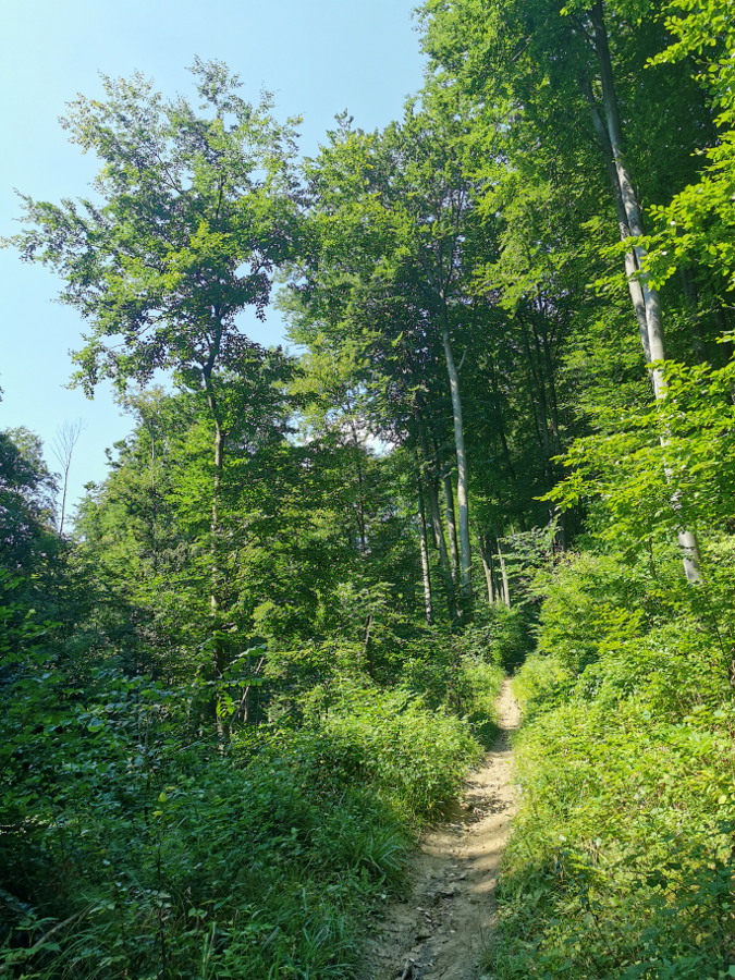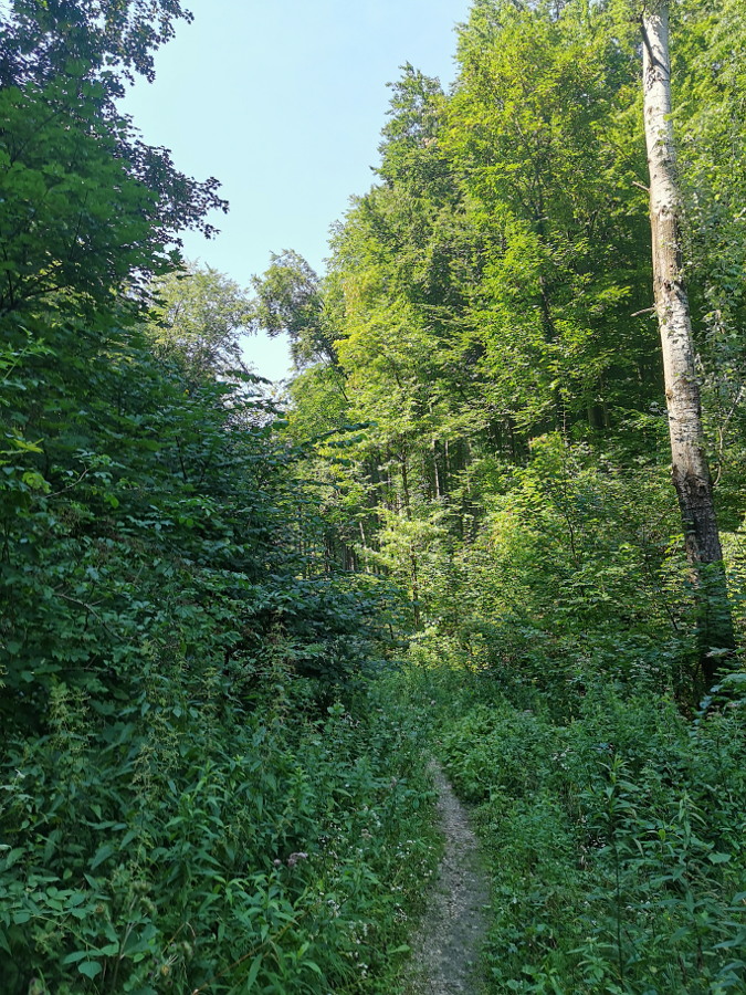 Allerdings nur kurz, das letzte Stück bis Hadersfeld war wieder sehr schmal und dicht bewachsen. Teilweise schob ich, weil es zu steil bzw. der Untergrund zu rutschig war. Relative frische Sturmschäden haben außerdem den Wurzelteller mitsamt des Steiges herausgerissen, da klaffen ein paar große Löcher im Weg.