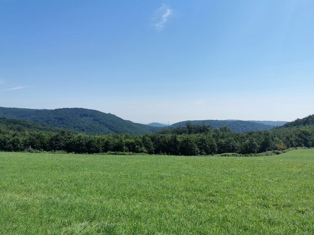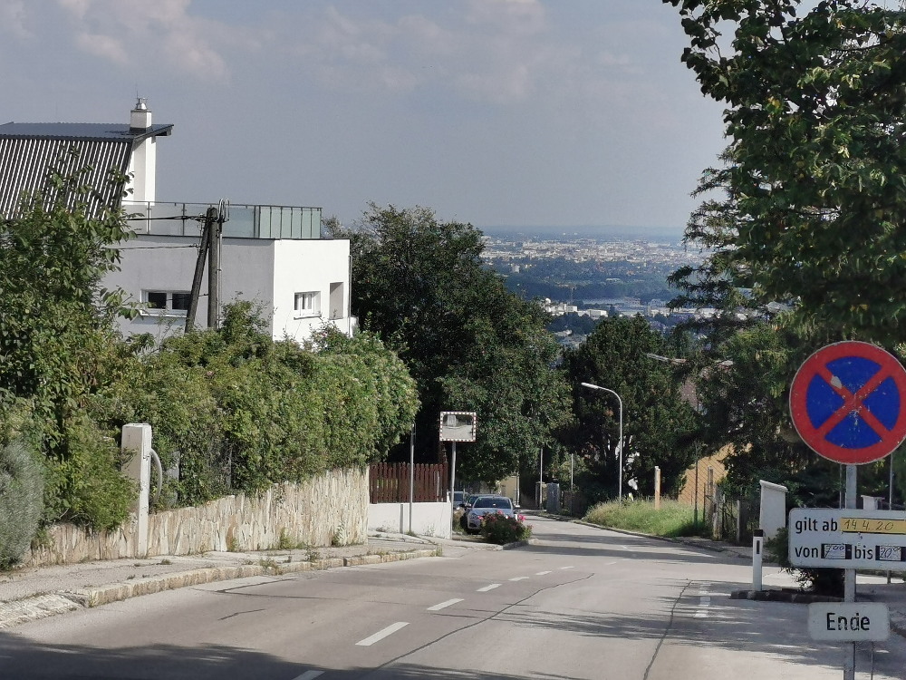 Dort knallte die Sonne besonders auf den Asphalt, aber die Abfahrt machte Spaß. Am höchsten Punkt befindet sich das typisch wienerische Gasthaus zum Windradl, das aber nur untertags geöffnet hat. In der Hüttelbergstraße war furchtbar viel Gegenverkehr und kein Radweg, dafür nochmal ein Trinkbrunnen zum Auffüllen (ich hatte eine 1,5L Trinkblase am Rucksack und tankte während dem Fahren). Dann gings nach links steil in die Knödelhüttenstraße. Die kannte ich noch von Mitte März, die erste Wanderung während dem Lockdown. Ich folgte der ausgeschilderten Route Richtung Sofienalpe. Erstaunlich flacher und kurzer Anstieg bis zur Franz-Karl-Ausssicht.