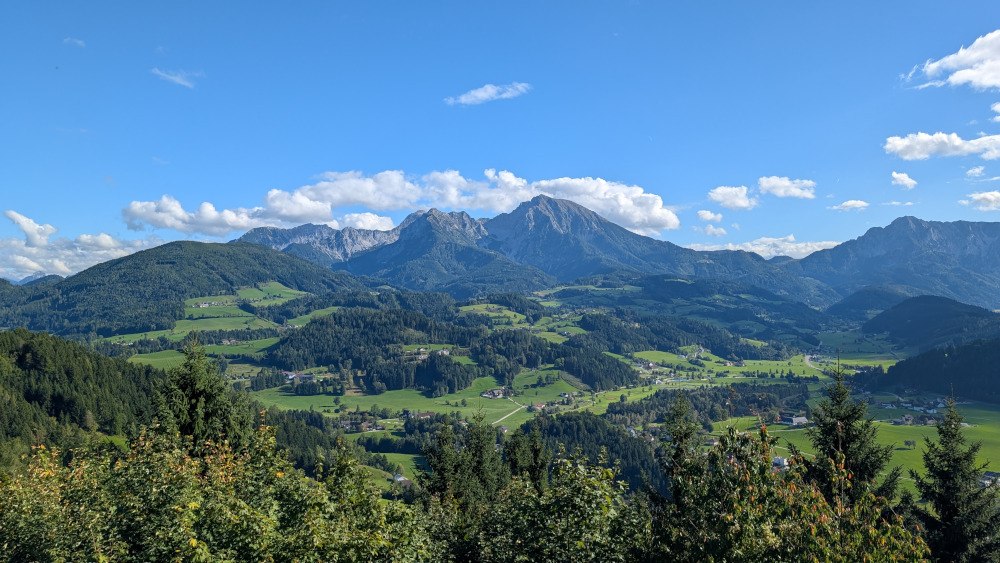 Links hinten Kleiner Priel (2136m), davor Schmeißerkogel (1324m) und Tamberg (1516m), abgesetzt Gschwendnerberg (1063m). Zentral hinten Kasberg (1747m) und Jausenkogel (1514m), rechts hinten Rieserschneid (1390m) und Hochedl (1424m), knapp schaut noch die Falkenmauer (1569m) durch und ganz rechts Spering (1605m). Im Vordergrund links Gunst (787m) und rechts Radingstein (901m).
