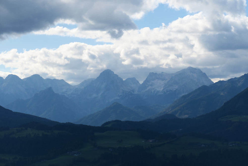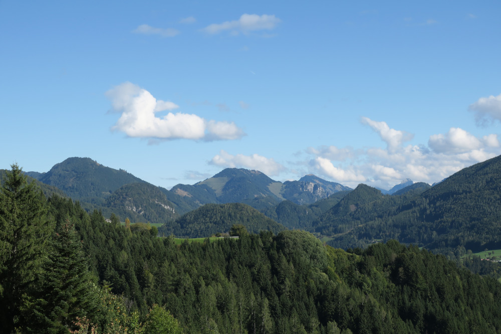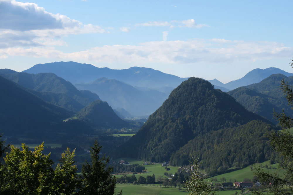 Blick nach Osten: Zeitschenberg (1433m) und der rundliche Pitschstein (1088m), Tannschwärze (1533m), Schwarzkogel (1554m), rechts gspitzt das Kleine Warscheneck (1090m). Das zeigt auch, dass Warscheneck kein Eigenname ist, sondern von wasch = scharf kommt – das kleine scharfe Eck gewissermaßen.