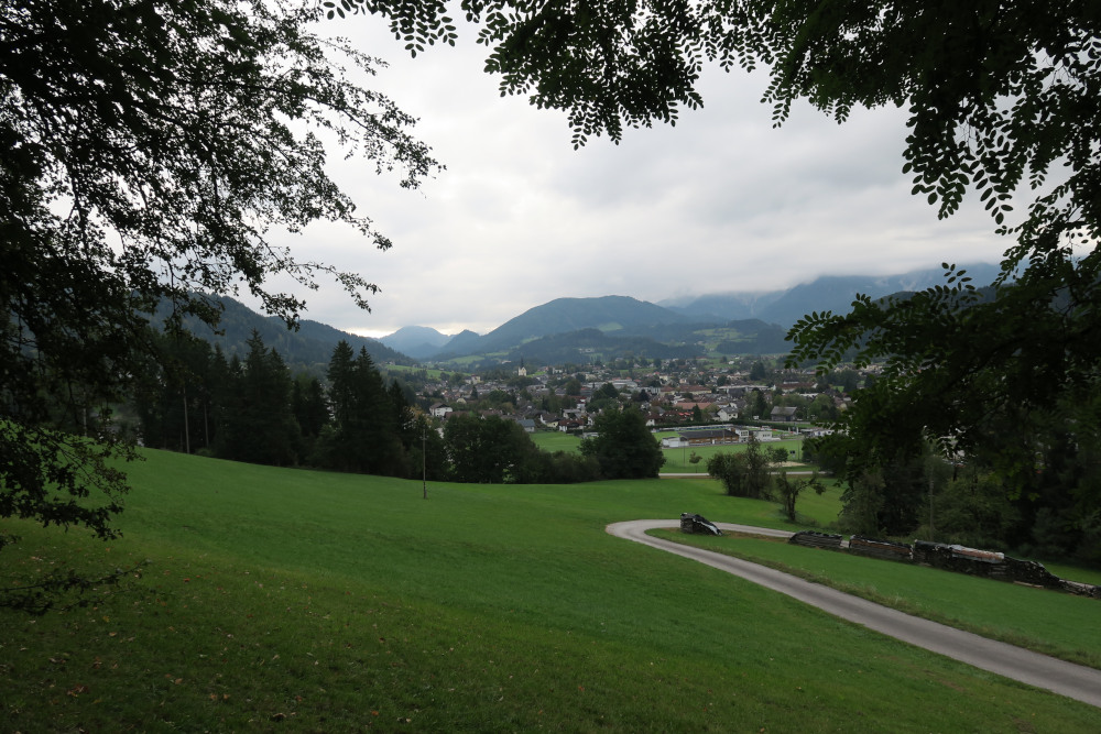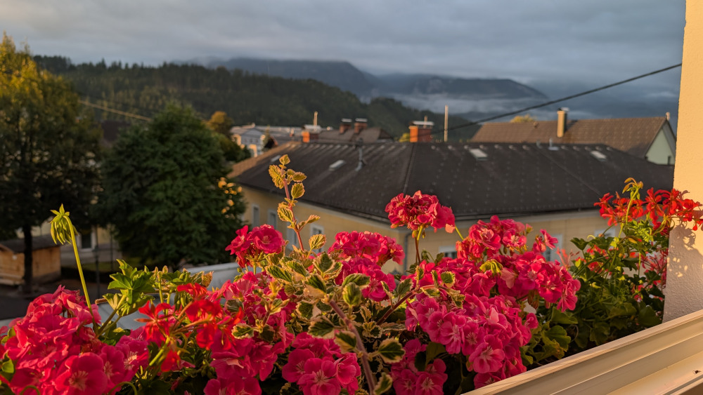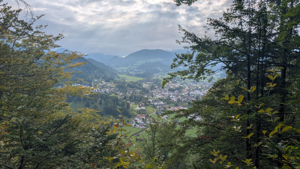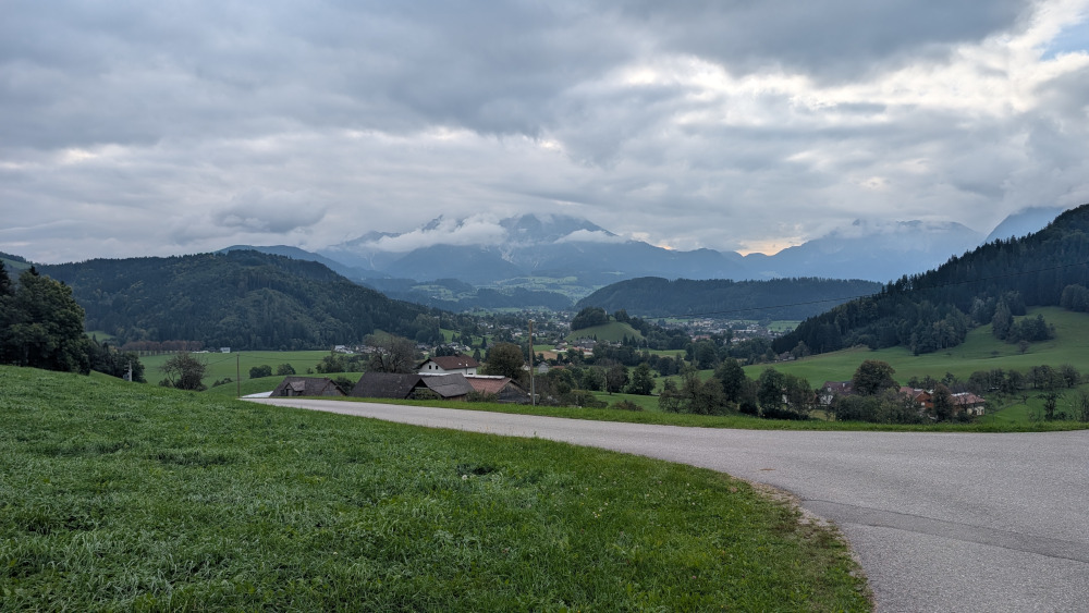 Der erste Blick aus dem Zimmerfenster zeigte das Tote Gebirge in kompakter tiefbasiger Bewölkung mit Nebelschwaden über dem Talboden. Ironischerweise schien im Ort aber die Sonne.