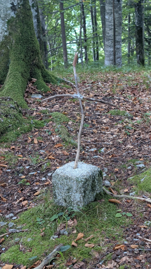 Beim höchsten Punkt mit dem KT-Stein suchte ich vergebens ein Gipfelkreuz, also bastelte ich ein kleines ….