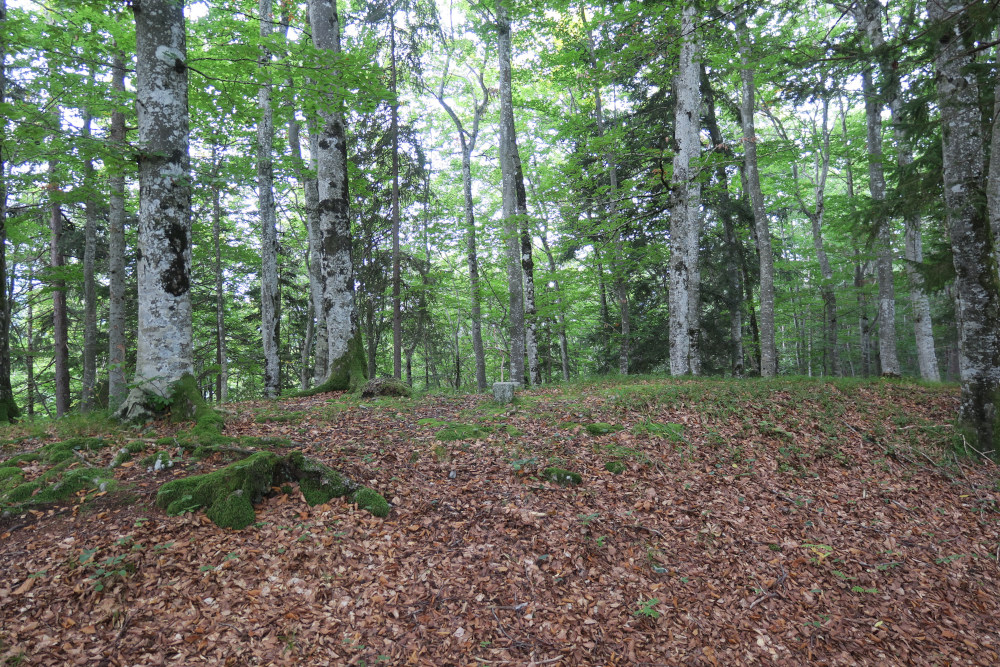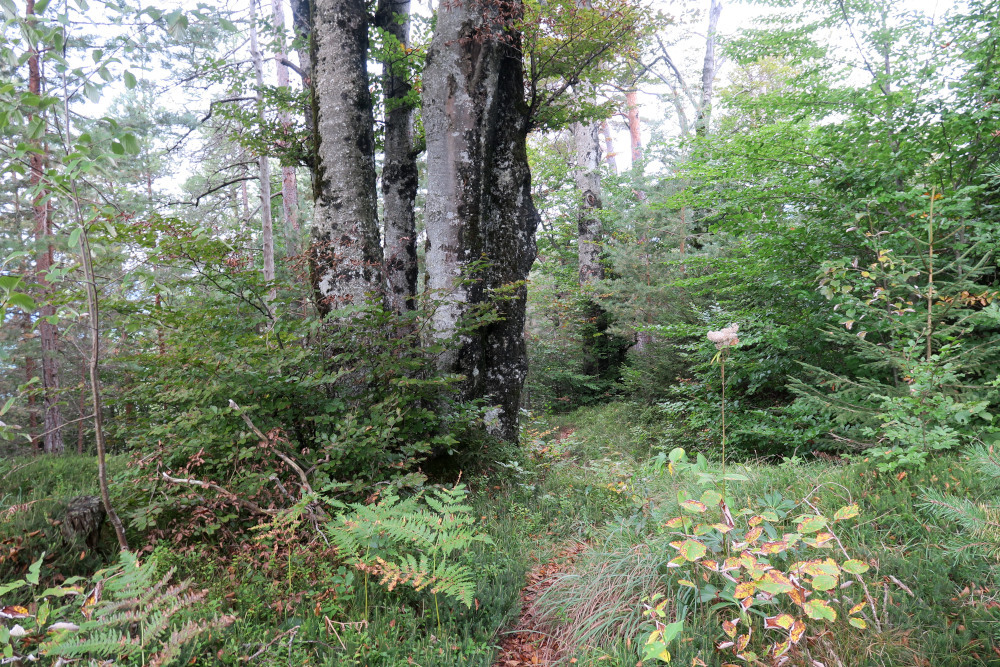 Nach der Scharte kam noch ein schmales Stück, und dann steil bergauf mit Windwurf zum drübersteigen. Der Steig war hier etwas abgerutscht, dafür der Hang eher harmlos. Dann erreichte ich den moosigen Kamm und fühlte mich versetzt in die Gutensteiner Alpen …