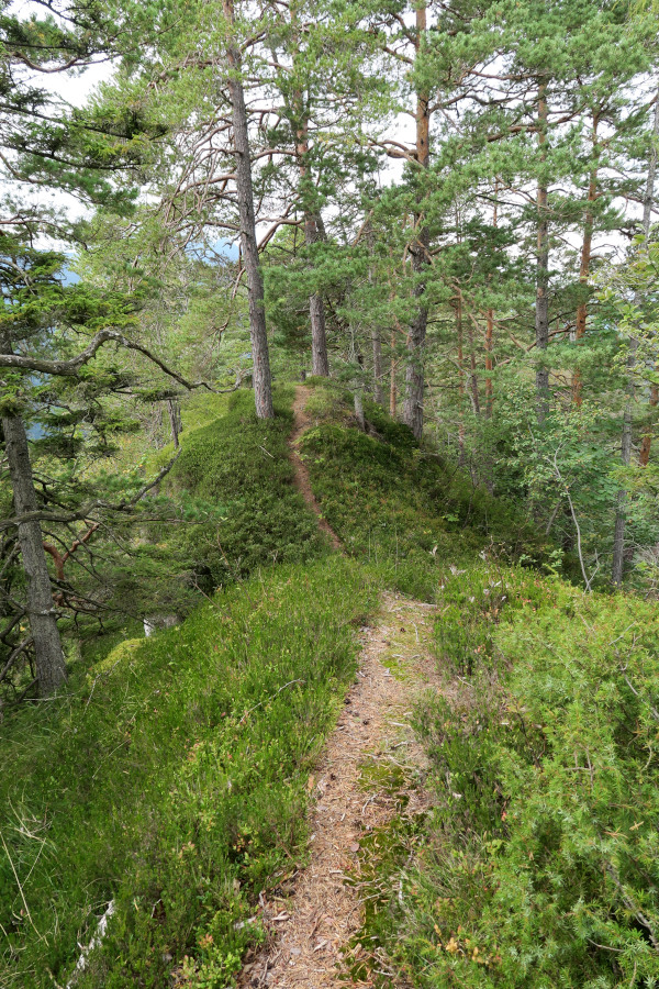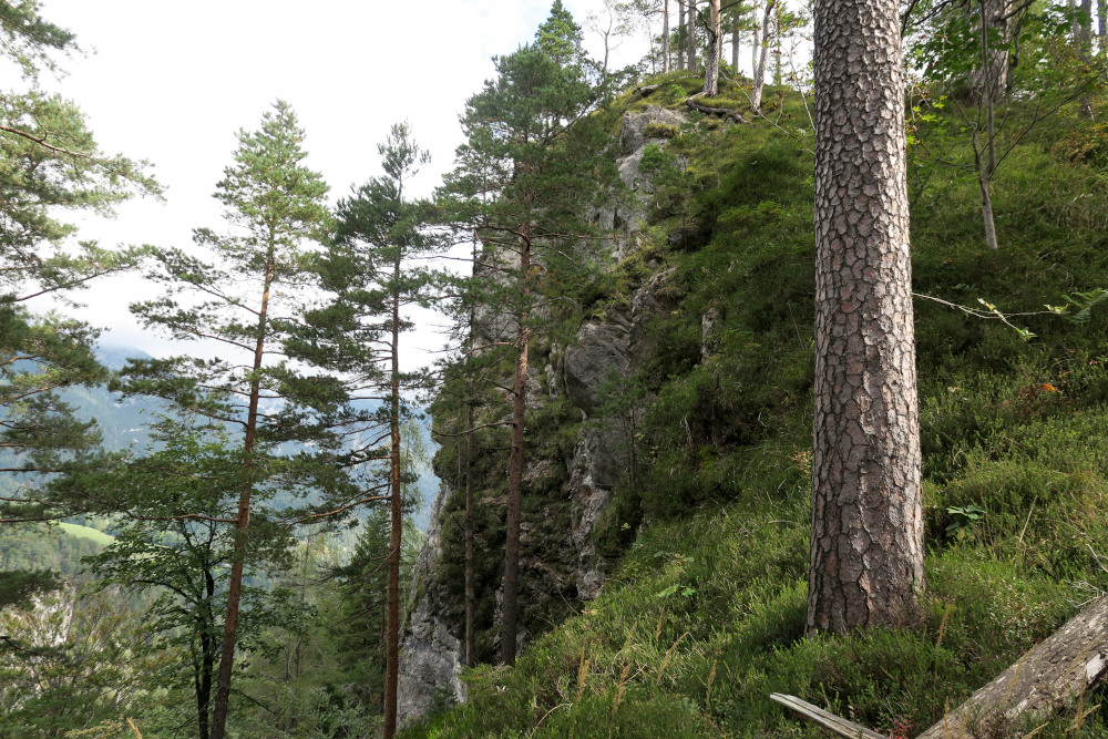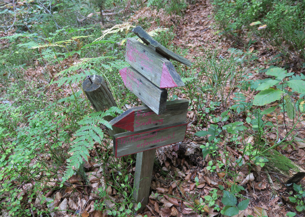 Bei einer Wegkreuzung stand beim Wegweiser Richtung Südwesten „Trittsicherheit erforderlich!“ – wahrscheinlich berechtigt, denn der Steig überwindet einen sehr steilen Hang. Gerade aus stand nichts dergleichen, was mich zuversichtlich stimmte, dass der Kamm machbar sein würde.