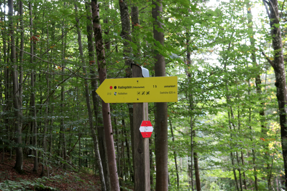 - Wegführung: Unterkunft (8.45) – Gunst (787m, 9.35) – Beginn Steig (10.55) – Radingstein (901m, 11.35-11.55) – Kleiner Hühnersteig (12.50) – Veichltal – Unterkunft (ca. 15.30)