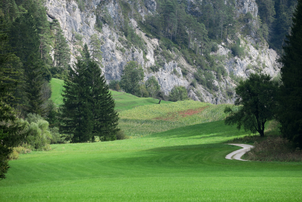 Im engen Tal des Hinteren Rettenbach verläuft der asphaltierte Radweg an der Nordseite des Radingbergs. Dieses Stück war eher fad und ich hätte mir ein Radl gewünscht. Interessanter wurde es dann im Veichltal – ein schmaler Graben zwischen dem Giererkogel-Sonnwendkogel-Höhenzug und dem Kamm vom Hahnbaum (1453m).