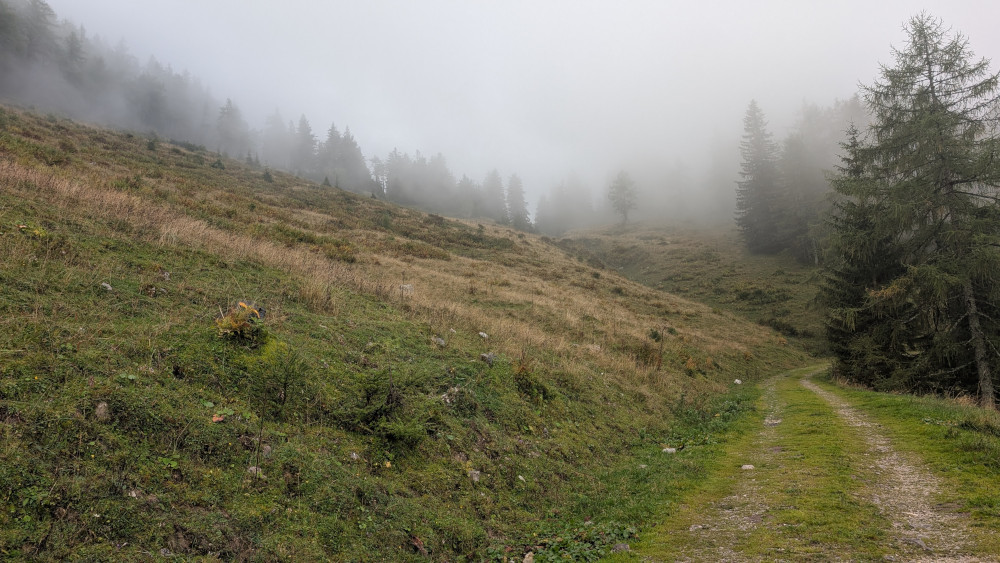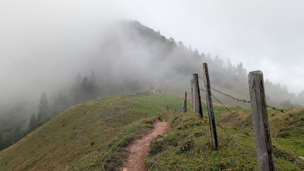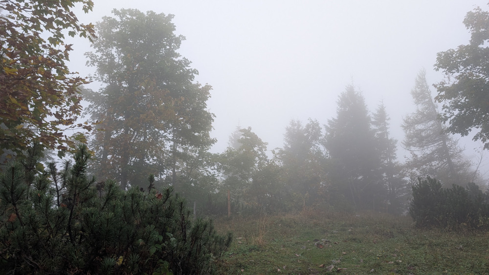 Ich schaute weiter, da das Gipfelchen überschritten werden konnte, doch weicht der Steig gleich mal in die steile und felsige Südflanke aus. Dort sah ich durch den Nebel die Fortsetzung nicht und kehrte daher um. Im Nachhinein die richtige Entscheidung.