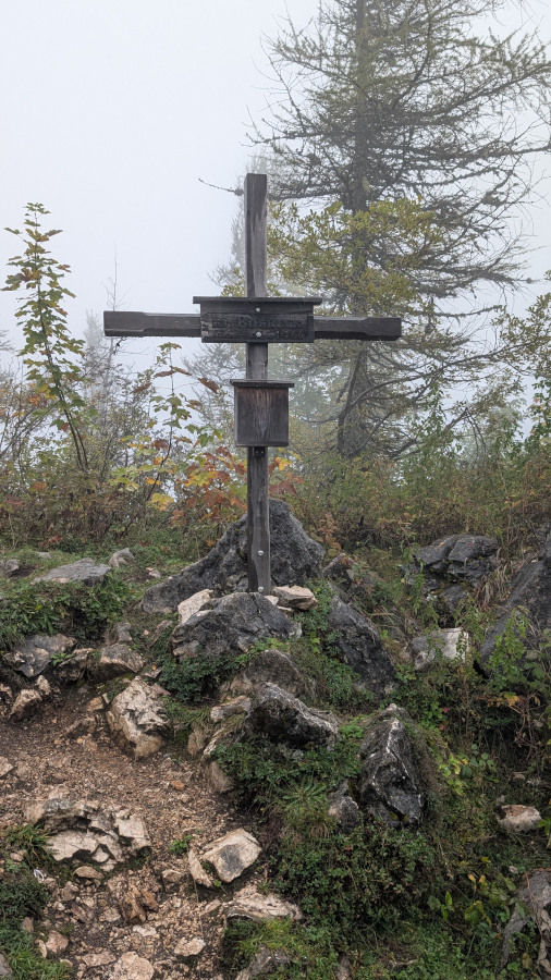 Nach etwas mehr als drei Stunden Gehzeit erreichte ich den Gipfel des Kleinen Bosrucks mit eigenem Holzkreuz. Ein schöner Platz, wo ich sonst gerne länger hätte verweilen können in völliger Abgeschiedenheit.