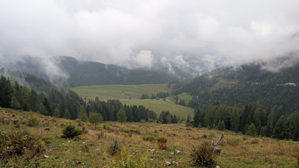 Die Hinweistafel für das Rohrauerhaus besagte, dass ausgerechnet in dieser Woche von Montag bis Mittwoch geschlossen war, aber selbst regulär hatte die Schutzhütte (!) einen Ruhetag. Das wusste ich zumindest schon vorher und plante daher die Einkehr in der Bosruckhütte oder in der Genußstube weiter unten. Den Weg über die Ochsenwaldalm direkt zum Arlingsattel hatte ich bereits aufgrund der Bodenverhältnisse verworfen – zu gatschig. Bei der großen Kehre, wo es geradeaus zum Rohrauerhaus ging und rechts zum Arlingsattel, lebte auch noch der Nordwind unangenehm böig auf. Gemeinsam mit dem Regen wurde mir kalt – ich hatte ja nur das kurze Leiberl unter dem Gilet und Regenjacke. Zum Glück war nicht allzu weit ein zugänglicher Niedersitz, wo ich zumindest regengeschützt war und mich umziehen konnte. Hier entschied ich, das Karleck auszulassen. Neben mangelnder Sicht und Regen kamen auch noch diverse Sturmschäden und frische Harvesterspuren dazu, die den Abstieg womöglich erschwert hätten.