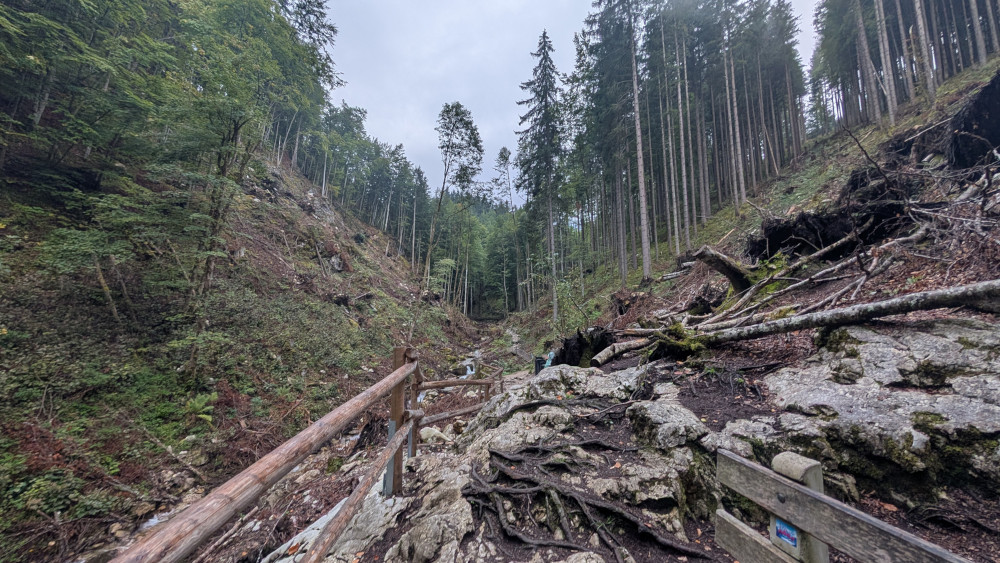 Kurz vor dem Ausstieg wurde dann erneut klar, dass das Septemberereignis 2024 längst nicht auf das Tullnerfeld oder Niederösterreich beschränkt war. Auch hier zeigten sich die typischen Schäden anhaltenden Starkregens kombiniert mit kräftigen Windböen – vollständige Entwurzelung der Bäume links und rechts vom Hang. Bei den letzten Besuchen war der Wald noch intakt. In fünf Tagen fielen in Windischgarsten 263mm Niederschlag, im unmittelbaren Staubereich zwischen Bosruck und Pyhrgas dürften es eher 300mm und mehr gewesen sein.