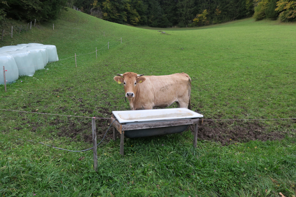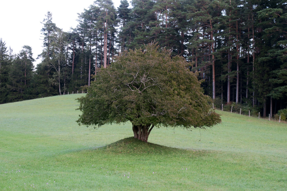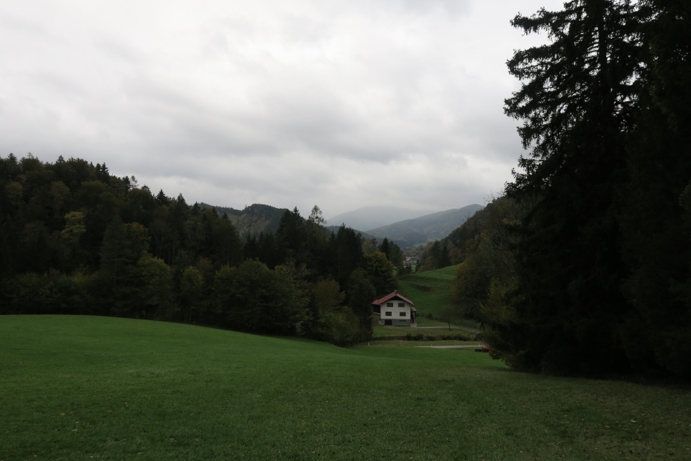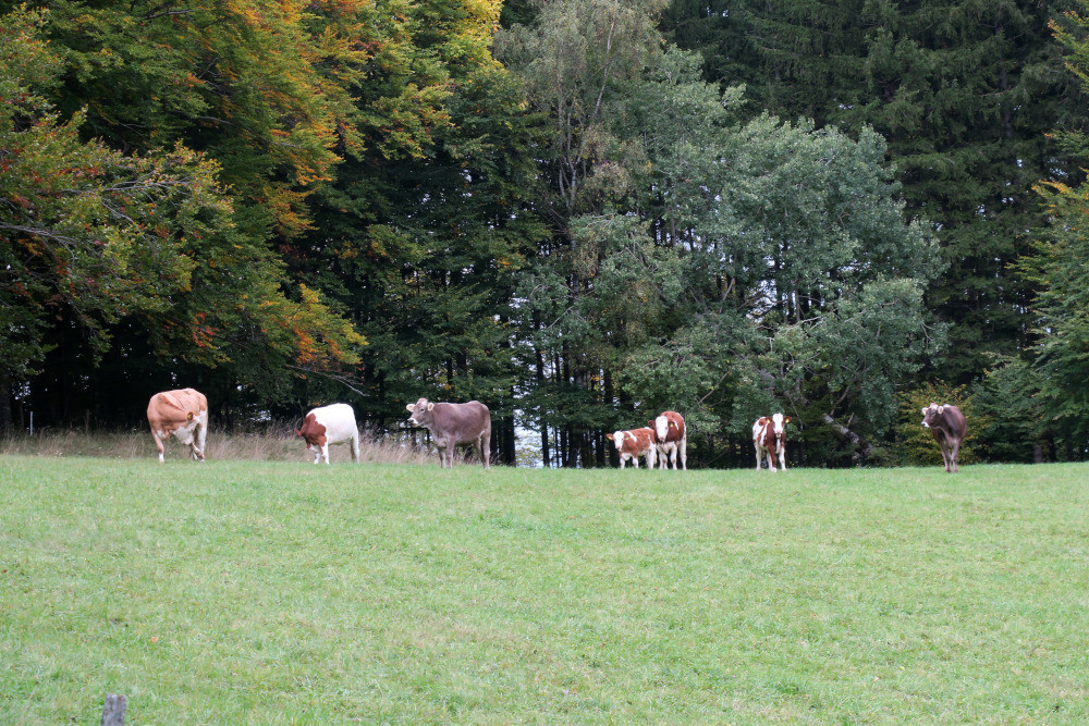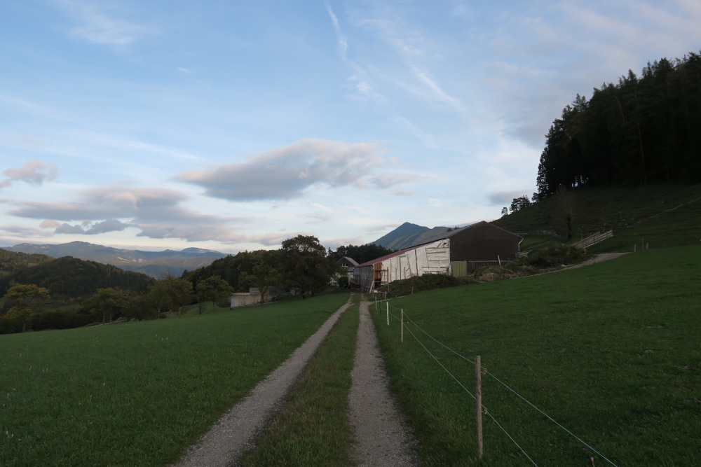 Mir war zugegeben etwas mulmig bezüglich Abstiegsroute zumute, da unser Weg nach der kurzen Gegensteigung vom Knedlhof weg bei einem Bauernhof vorbeiführen würde, wo ich im Mai 2023 mit einem Begleiter an einen Hannover’schen Schweißhund geraten war. Ursprünglich ging der Weg nämlich einmal mitten durch den Hof. Der Hund bellte uns aggressiv an, ging uns hinterher, als wir durch die Wiese den Hang hinabgehen wollten, und stupste uns dabei unsanft an. Der Bauer drohte damals, die Polizei zu rufen, weil wir sein Grundstück betreten hatten, und weigerte sich, den Hund zurückzurufen.
