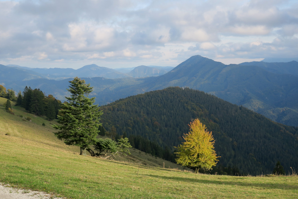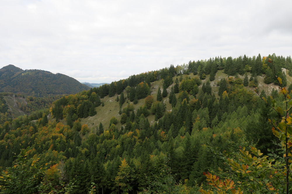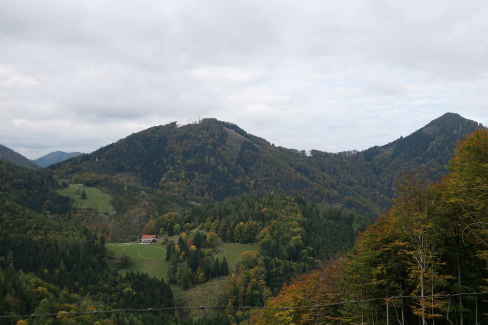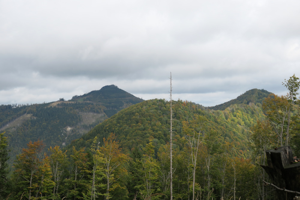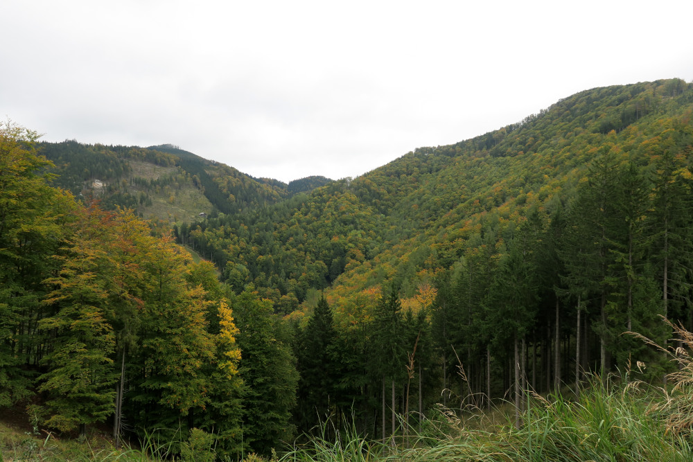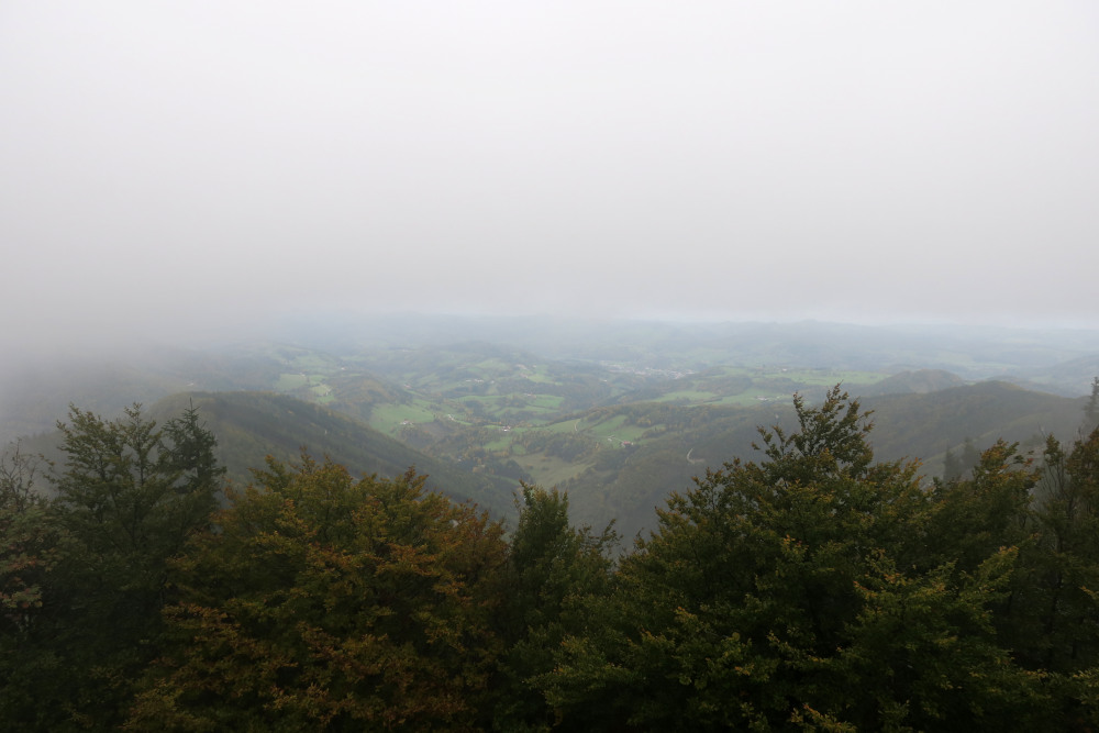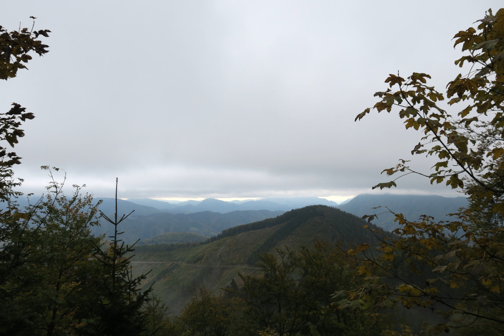 Recht spontan hat mich Günter gefragt, ob ich ihn bei seiner Bike & hike Überschreitung begleiten will. Also haben wir unserer Räder aufgezurrt und sind zuerst nach Türnitz zum großen Parkplatz gefahren, wo wir gegenüber aus dem Sulzbachgraben am Abend zurückkommen würden. Von dort mit dem Rad am schönen Traisentalradweg zum Ausgangspunkt am Stelzerbach. Das Wetter zog ein Sauerkrautgesicht. Ich hatte an den Vortagen etwas schlampig nur auf den Hochdruckeinfluss geschaut und erst bei näherer Betrachtung gesehen, dass feuchte Atlantikluft unter einer starken Inversion zu hartnäckigen Ausbreitungsschichten führen würde – vulgo kompakter Stratocumulus. Womit ich nicht gerechnet hatte, war das starke Nieseln ab dem Gölsental über den Gerichtsberg bis ins Traisental. Beim Wegfahren war es beinahe eine Mischung aus Nieseln und leichten Regen. Jacke mit Kapuze hatte ich keine mit. Das fing ja gut an ;), aber es wurde im Laufe des Tages dann freundlicher und am Eisenstein hatten wir sogar ein paar Sonnenstrahlen.