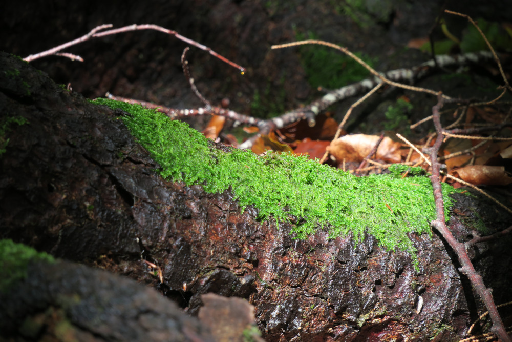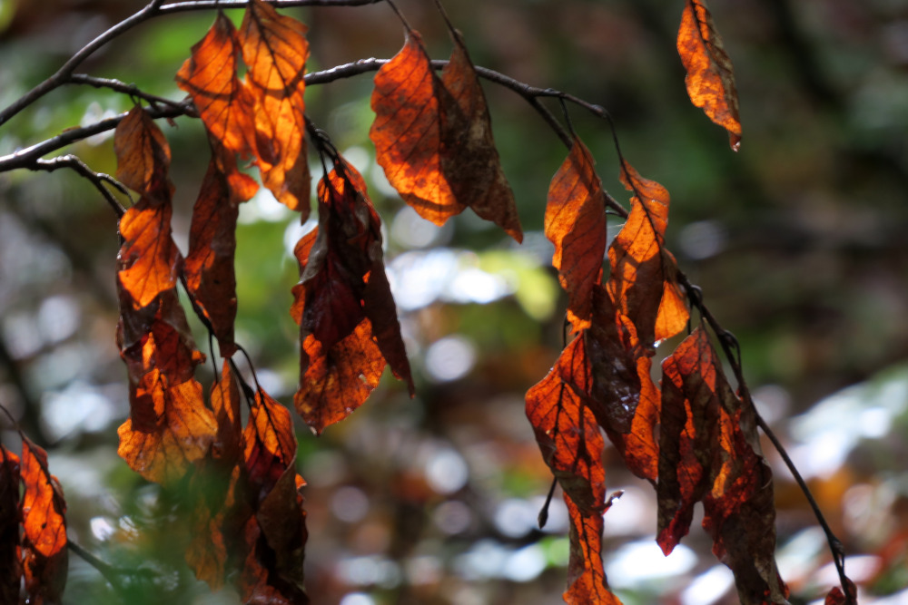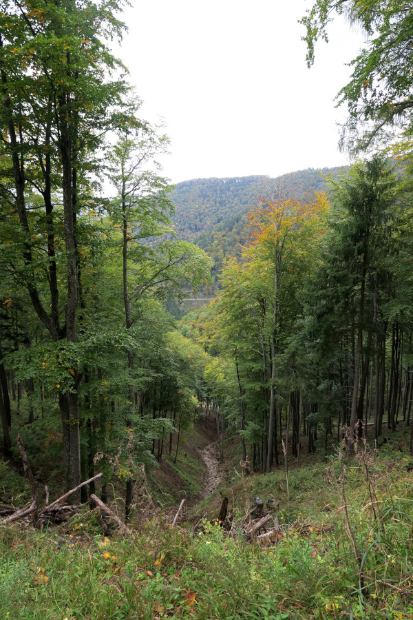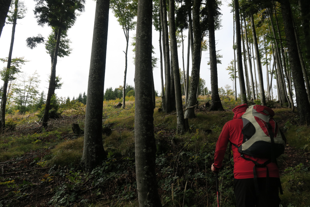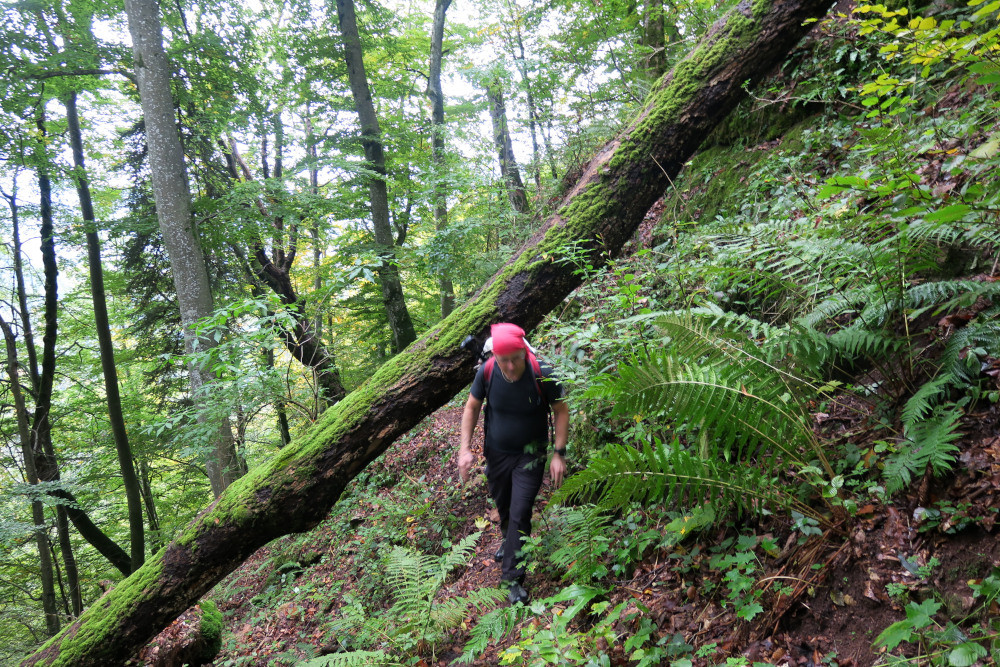 Zunächst verläuft der weitere Anstieg auf einem schmalen Steig, der den steilen Osthang querte. Auch hier unaufgeräumte Spuren vom September 2024 und ein riesiger Buchenstamm zu überklettern.
