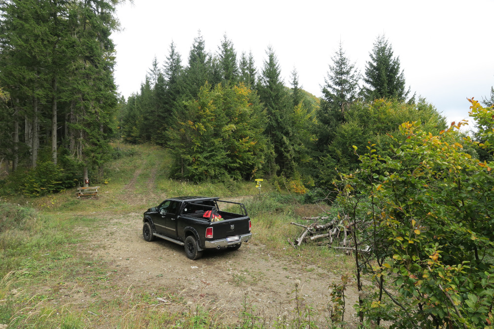 Nach etwas mehr als einer Stunde Gehzeit erreichten wir das Gscheid, wo ein riesiger Pickup abgestellt war, laut Aufkleber ein Wachtelhund-Besitzer. Schöne Hunde.