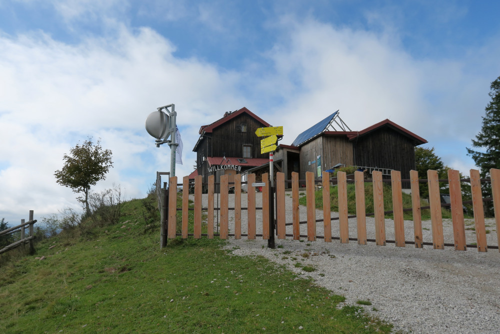 Günter und ich schauten kurz in die Hütte, die bis zum letzten Mal voll war, bei entsprechender Akustik. Wir wollten eh nur etwas trinken und stellten uns mit dem alkoholfreien Bier nach draußen. Recht große Mehlspeisenauswahl. Die Wandergruppe kam etwa fünf Minuten nach uns und war entsprechend konsterniert, dass sie sich nicht reinsetzen konnten. Es stellte sich heraus, dass der Hüttenwirt extra für sie gekocht hatte, denn es waren alles Veganer. Er entschuldigte sich beinahe dafür, keinen Platz zu haben, aber es sei eine Schutzhütte, da könne er niemanden abweisen, der vorher schon da war. Zum Wetter meinte er trocken „Die Sonne kommt gleich“ und „Das ist unser einziger schlechter Witz.“ – sie sollte aber etwa eine Stunde später tatsächlich noch kommen. Zwischendrin kamen weiterhin mehr Wanderer als gingen.