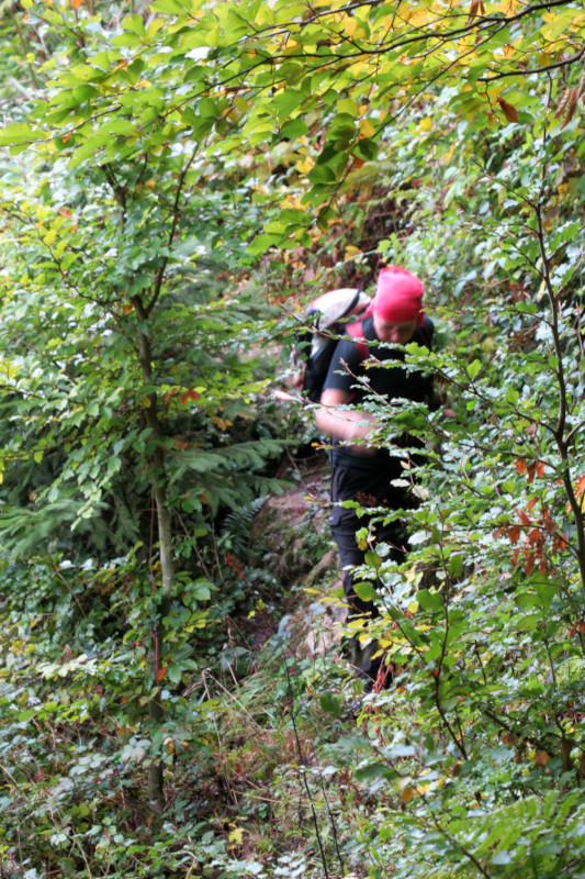 Nach längerem Forstwegabschnitt kam die lange Querung ins Zittertal, teils sogar mit Seil zum Anhalten. Am Nationalfeiertag 2022 stiegen wir dort ab, allerdings bei trockenen Bedingungen. Das Septemberhochwasser 2024 hatte auch dort sichtbare Spuren hinterlassen. Umgestürzte Bäume waren zu übersteigen oder unterkraxeln, teilweise war der Steig abgerutscht oder sehr verwachsen. An einer Stelle mussten mehrere Bäume gefällt werden. Nach der Querung waren meine Hosenbeine waschelnass, trockneten aber zum Glück bald wieder.