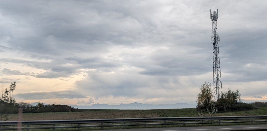 Daher beginne ich mit meinen Smartphone-Schnappschüssen aus dem fahrenden Bus heraus, alle auf der Westautobahn zwischen Amstetten und Linz aufgenommen. Los gings um 14 Uhr bei der U4-Endhaltestelle Hütteldorf bei warmen 20°C. Da lag der Donauraum noch mitten im Warmsektor mit dünner Cirrusbewölkung. Eine Stunde später zog zunehmend mehrschichtige Bewölkung der Kaltfront auf, vor allem Altocumulus und erste Fallstreifen (Bildmitte). Darunter fiel die ausgeprägte Dunstschicht auf, die mit relativ hohen Taupunkten um 11-13 Grad einherging.