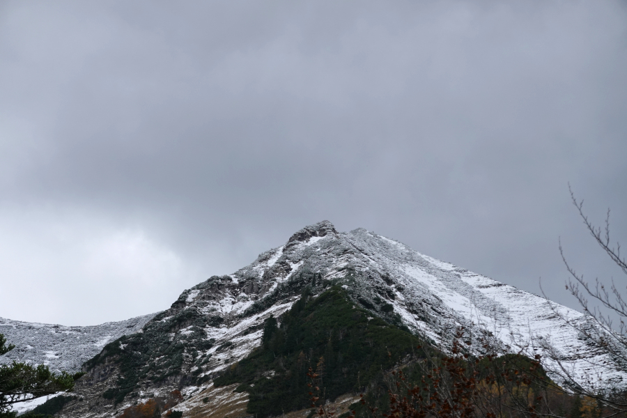Das Frühstück sah zwar so aus wie auf der vegetarischen Jausensackerl-Box (für 17,50 Euro), doch war das Gebäck alt und hart und nicht vernünftig zu schneiden. Es waren wesentlich mehr Beilagen dabei als Gebäck, die reichten noch für den Folgetag. Kaffee gabs aus dem Automaten (1,50-2,50 Euro pro Becher). Die Zimmer waren in Ordnung, Heizkörper suchten wir aber vergebens. Nach dem Starkregen am Abend sank die Nullgradgrenze in der Nacht vorübergehend gegen 1400m ab. Oberhalb davon fielen rund 10-20cm Neuschnee. Damit schieden die ursprünglich im Tourenprogramm stehenden Gipfel Zimnitz und Sandling defacto aus, insbesondere letzterer hätte mich sehr interessiert, nachdem er öffentlich nicht ganz leicht machbar ist. Für Freitag waren weitere Regen- und Graupelschauer im Tagesverlauf bei lebhaften Westwind angesagt. Viele sollten es nicht sein laut Lokalmodellen. Csaba gab daher die Überschreitung des Gspranggupf vor. Der unaussprechliche Gipfel wurde laut älteren Karten bereits vor über 130 Jahren so genannt. Wir starteten am etwas verwinkelt auffindbaren Parkplatz oberhalb von Pfandl direkt am Beginn der Engen Zimnitz.