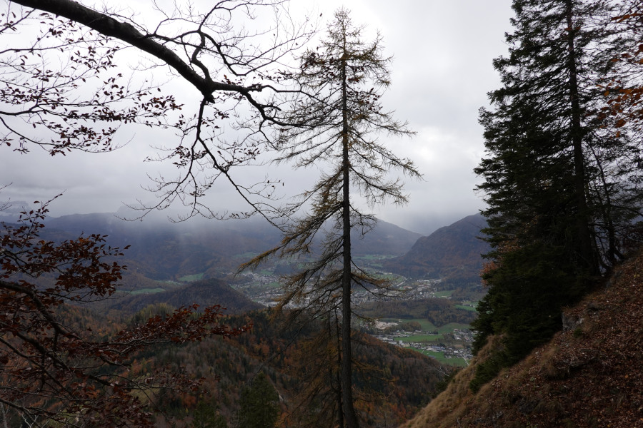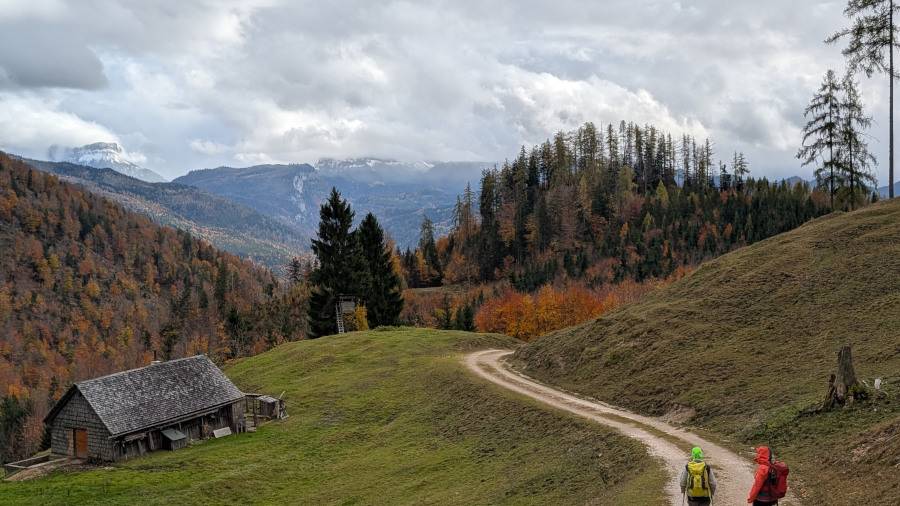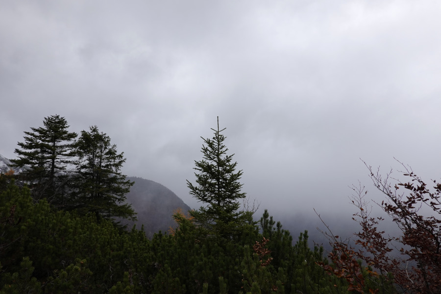 Unter der Walze wurde es ziemlich finster und die Blätter wirbelten durch die Luft, über die Autobahn. Aber erst danach kam der starke Regen, der uns bis Bad Ischl nicht mehr verlassen sollte. Als wir bei der Autobahnraststätte Landzeit (gähnende Leere, aber nicht verwunderlich bei den Flughafenpreisen) beim Voralpenkreuz einen kurzen Stopp einlegten, hatte es schon merklich abgekühlt. In Bad Ischl bezogen wir das Bett & Berg neben der Talstation der Katrin-Seilbahn, der einzige gravierende Nachteil war das fehlende Frühstück vor Ort, das man allerdings am Vorabend bestellen konnte. Bis 08 Uhr Nachtruhe deutete außerdem eher auf Seilbahnwanderer hin als für echte Tourengeher. Erstmals versuchten wir es beim Weissenbachwirt bei Bad Goisern, wo ich letzten Herbst gut eingekehrt bin. Der Wirt klang am Telefon gestresst und hatte keinen Platz mehr für acht Personen. Beim Gasthaus Pfandl wurden wir dann fündig, und das Essen war hervorragend – ich nahm die Hirschmedaillons.