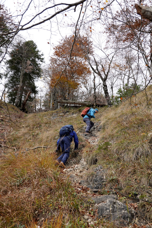 … gings ans Eingemachte: Hinter der Brücke wurde der Weg sofort steil, ein über weite Strecken schmaler Steig, laubbedeckt, in unzähligen Kehren wanden wir uns den Riedel hinauf. Währenddessen zogen bereits erste Schnee- und Graupelschauer durch.