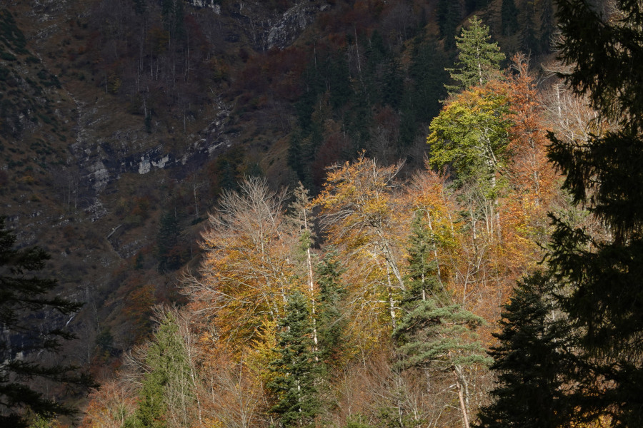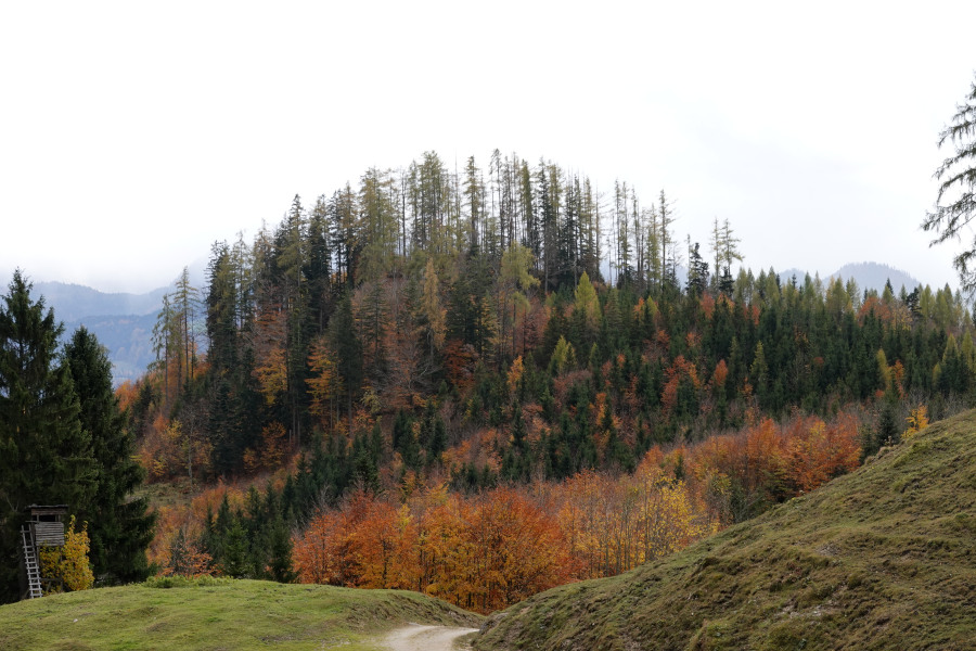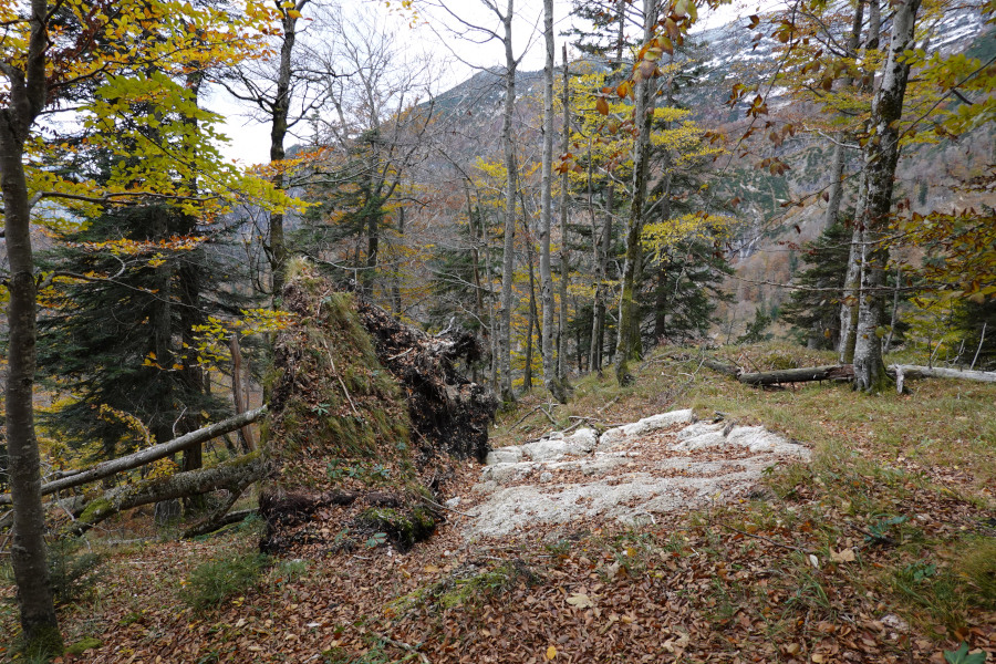 Wir aber gingen nach Osten weiter, zunächst durch das ausgedehnte Schadholzgebiet, dann nahe an den steilen Nordabbrüchen Richtung Weißenbachtal entlang, die etwas Aussicht boten.