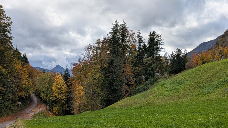 Über den Forstweg stiegen wir nach Jainzen ab, dabei regnete es leicht. Der Rückweg zum Parkplatz führte uns zunächst entlang der Straße nach Westen.