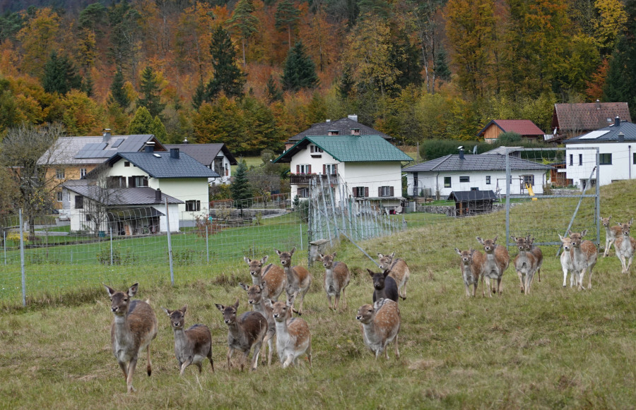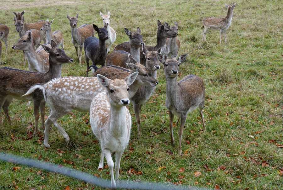 Bei einem großen Damwildgehege stürmte plötzlich das ganze Rudel im Schweinsgalopp auf uns zu. Normal rennen sie ja eher von mir weg. Ein paar junge Individuen hüpften mit allen Beinen in der Luft über die Wiese wie verspielte junge Hunde und jagten quer über die ganze Weide.
