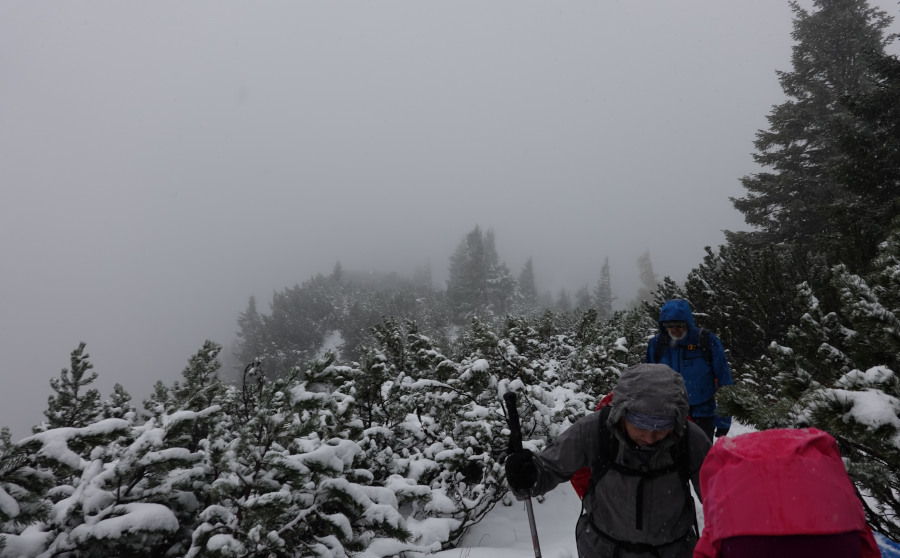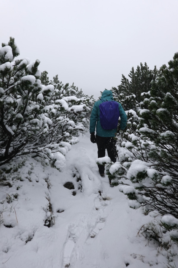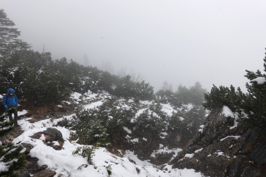 Der Schneefall blieb feucht, das heißt, die Nullgradgrenze pendelte um 1500m herum. Damit wurden wir schnell durchfeuchtet, die Handschuhe nass, und man sah nichts mehr, außer zunehmend Schnee am Weg.