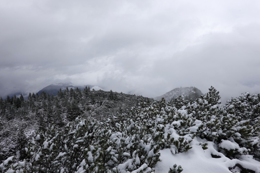 Bevor wir endgültig und nachhaltig eingenebelt wurden, hatte man unter dem Schneeschauer noch eine gute Durchsicht nach Süden Richtung Grimming (links), Sarstein (mittig) und Dachstein (rechts)