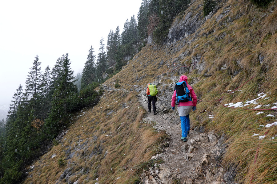 Im obersten Abschnitt gibt es ein lose hängendes Stoffsteil. Danach wird es links ordentlich ausgesetzt, was der Latschenbewuchs etwas kaschiert.