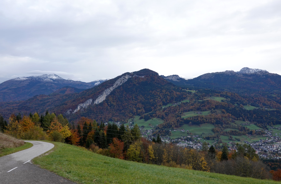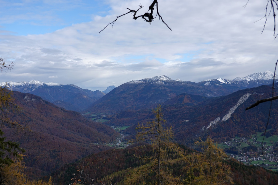 Über das Gosautal führte damals die 24-Stunden-Wanderung, ebenfalls bei Null Sicht. Umso schöner nun die Gesamtübersicht zu haben. Im Vordergrund links der felsige Leitgebkogel (1220m), dahinter das langgestreckte und großteils bewaldete Plateau des Löckenmoosbergs – dem Löckenmoos stattete ich im Vorjahr einen Besuch ab, leider war es großteils eingeschneit.