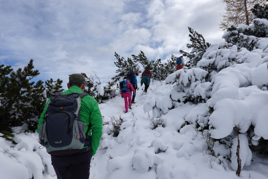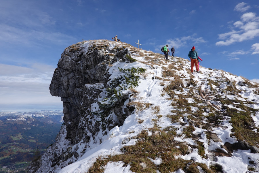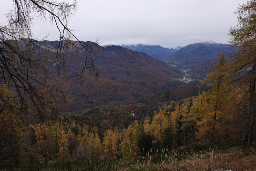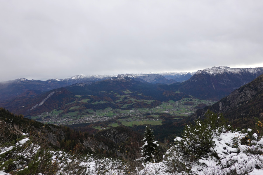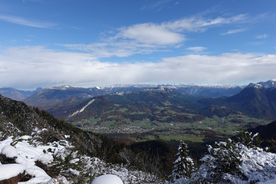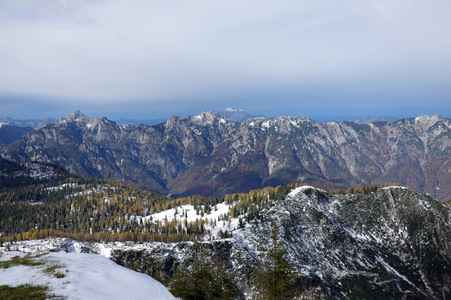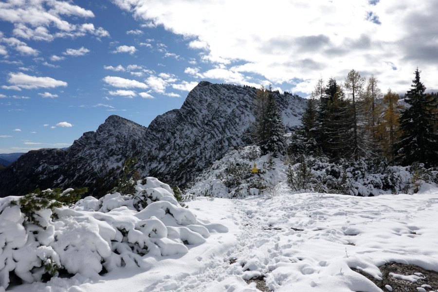 Der Weiterweg war schneebedeckt, mit etwa 20-30cm Neuschnee, aber unschwierig. Vom Kamm bot sich eine herrliche Aussicht, die durch die Kontraste mit dem grün-herbstlaubverfärbten Tal noch besser wurde.