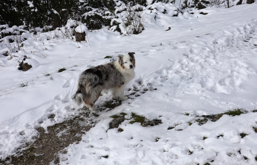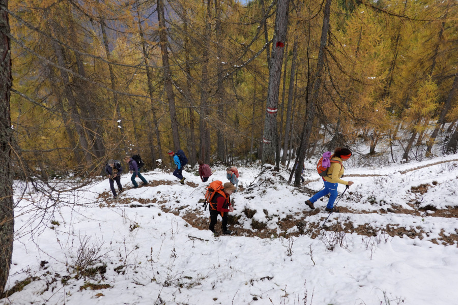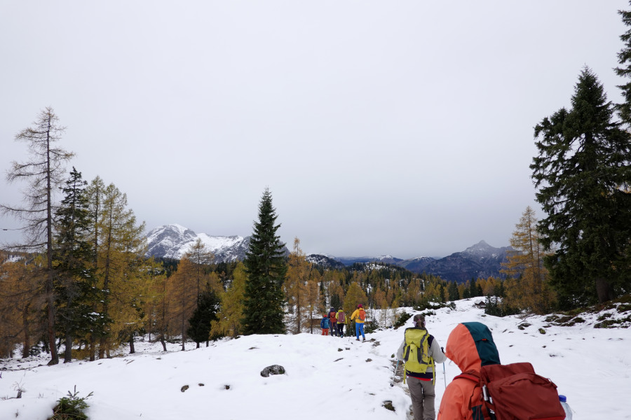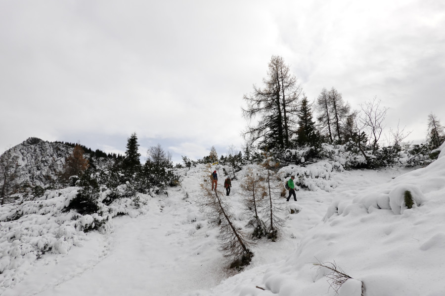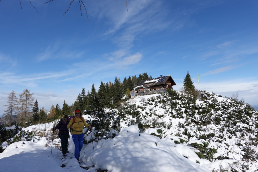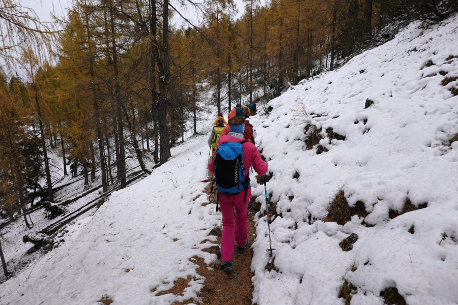 Nach der kurzen Pause bei der Pramesbergerrast (Unterstandshütte) verließen wir den exponierten Riedel und stiegen im goldenen Lärchenwald weiter auf. Ab etwa 1300m begann bereits der Schnee, doch war der Steig selbst fast bis zur Hütte nahezu schneefrei.
