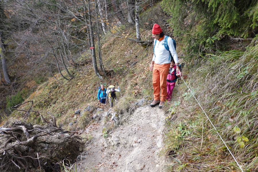 Der markierte Steig ging nach kurzem flachen Stück gleich ordentlich zur Sache, in vielen steilen Kehren schraubten wir uns höher. So wie überall im Salzkammergut auch hier zahlreiche vollständig entwurzelte Bäume vom September 2024. Das Schadensprofil von diesem Ereignis ist einzigartig – die Kombination aus 300mm Niederschlag (und mehr) und schwerem Sturm findet man sonst nur bei tropischen Wirbelstürmen. Deswegen hat es wesentlich mehr Bäume komplett entwurzelt (aus der aufgeweichten Erde gehoben) als gebrochen, wie normalerweise bei Winterstürmen oder eng begrenzten Gewitterböen. Dieser Fußabdruck lässt die Schäden von damals gut unterscheiden von anderen Ereignissen.