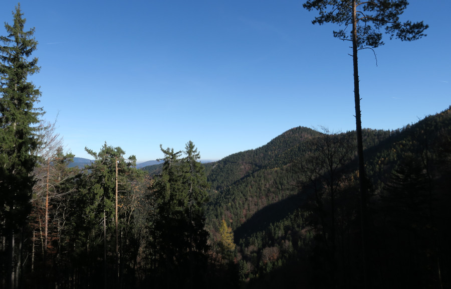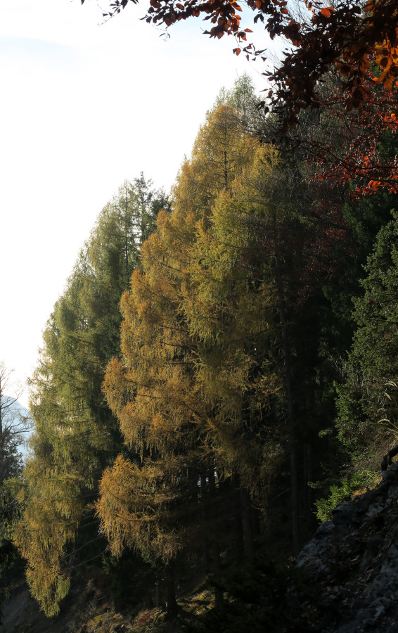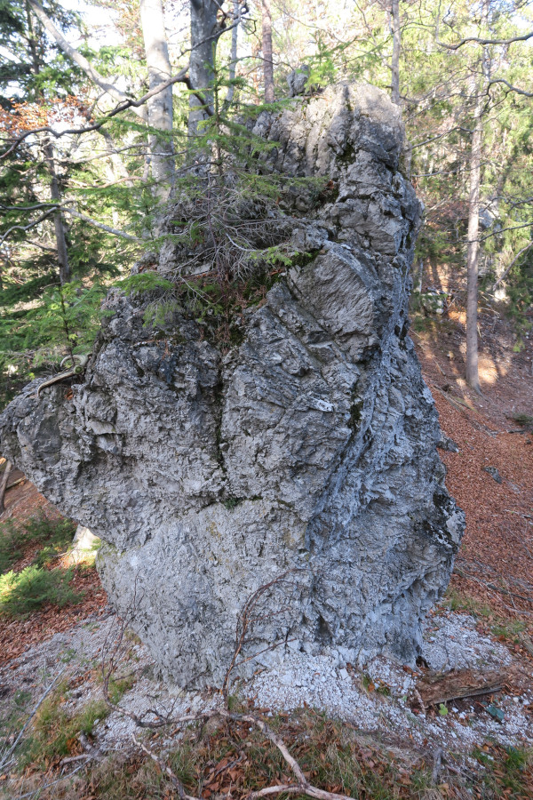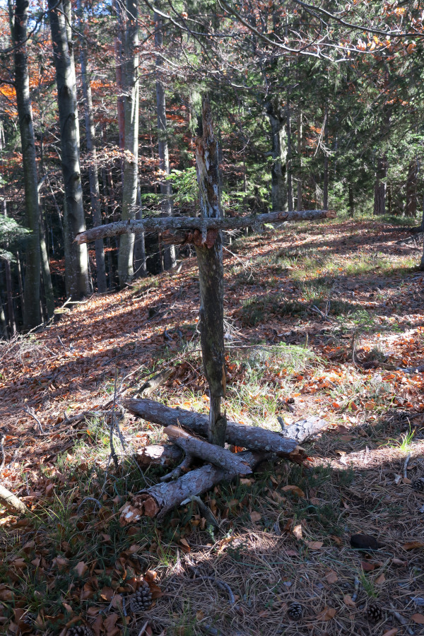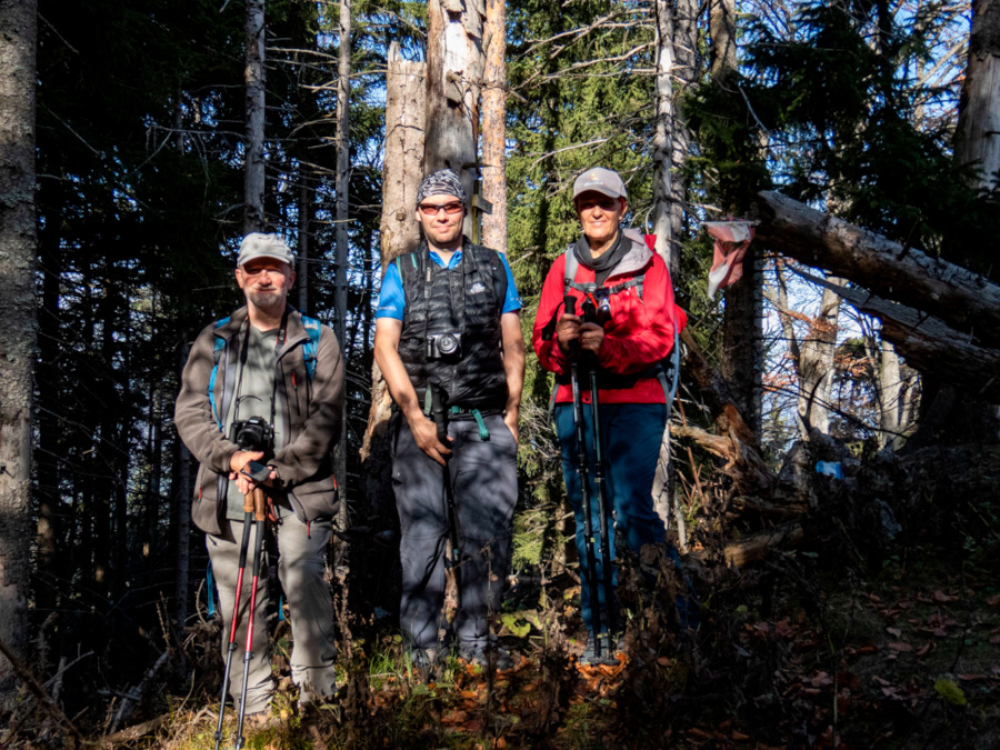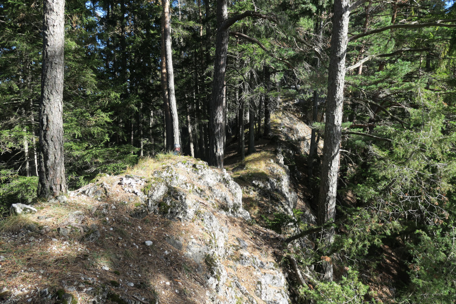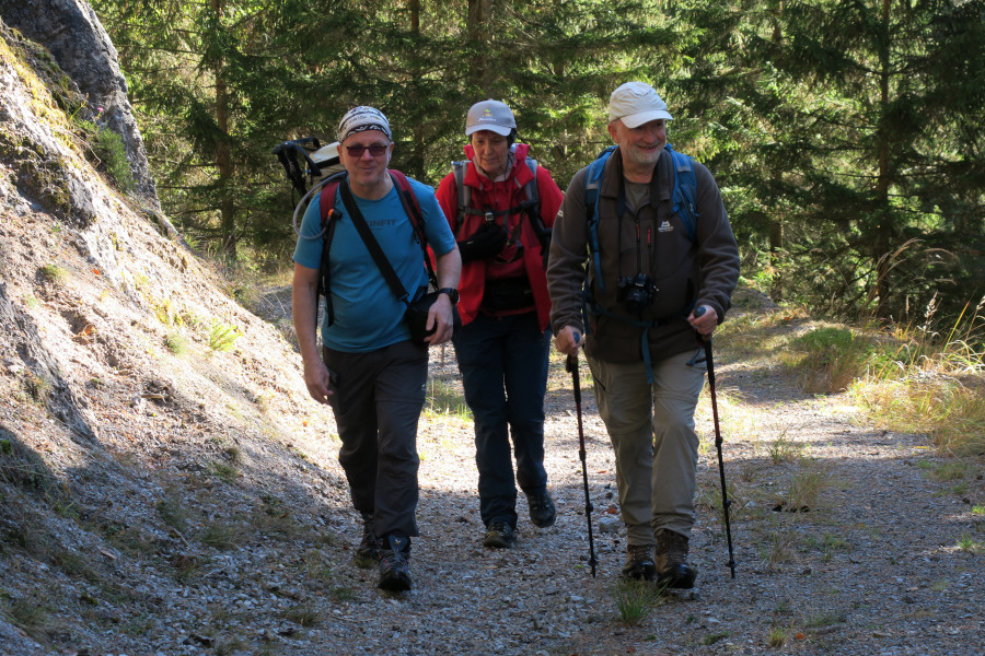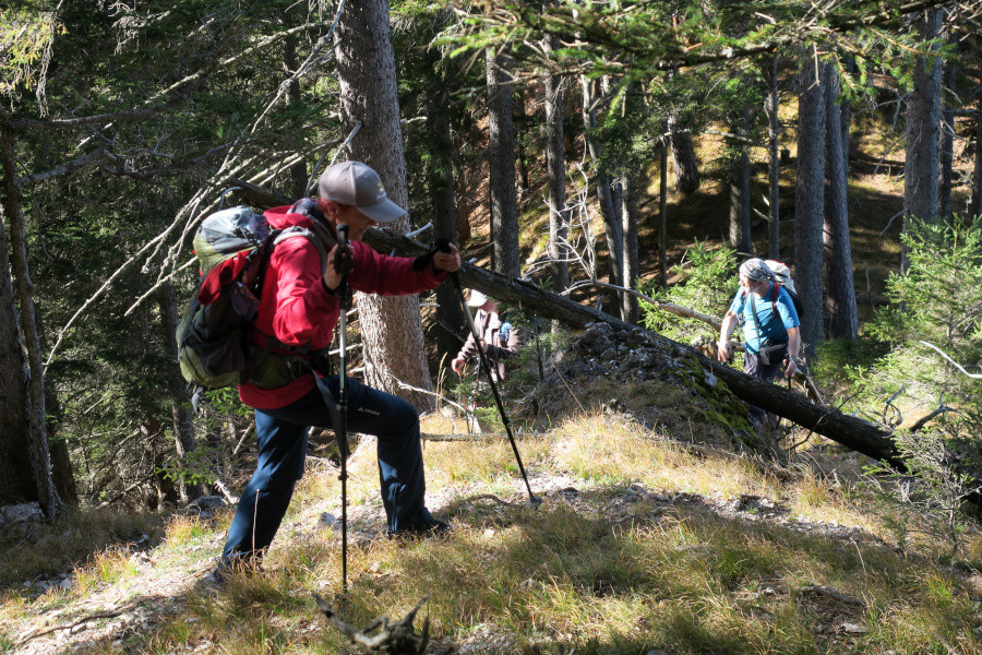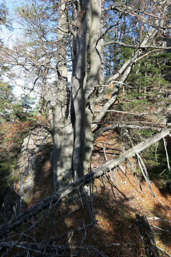Günter und ich wählten die steile Mulde, dafür mit flachem Auslaufen zum Forstweg. Weiche Erde und damit angenehm zu gehen. Wolfgang und Eli blieben am Rücken, dafür war der Abstieg über die felsdurchsetzte Forstwegböschung etwas mühsamer.