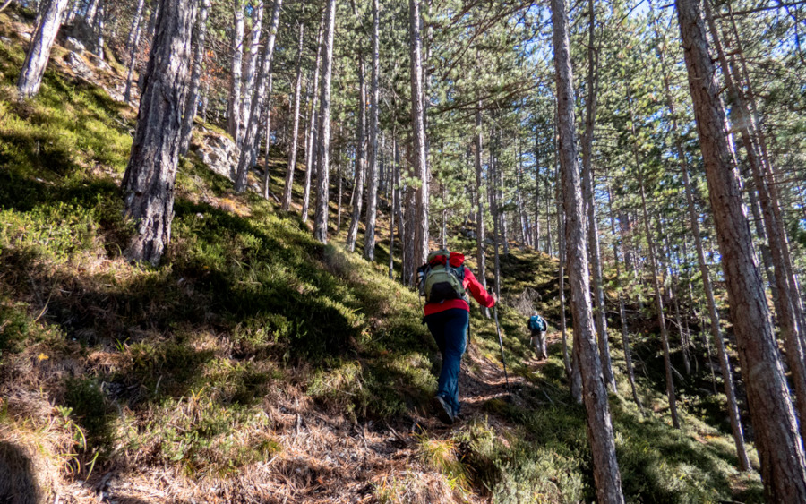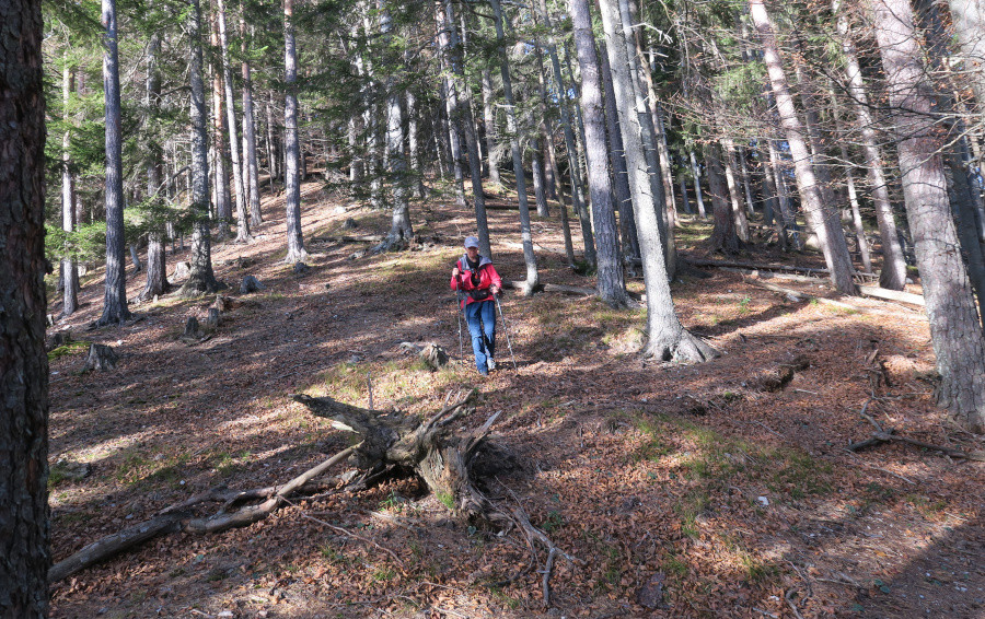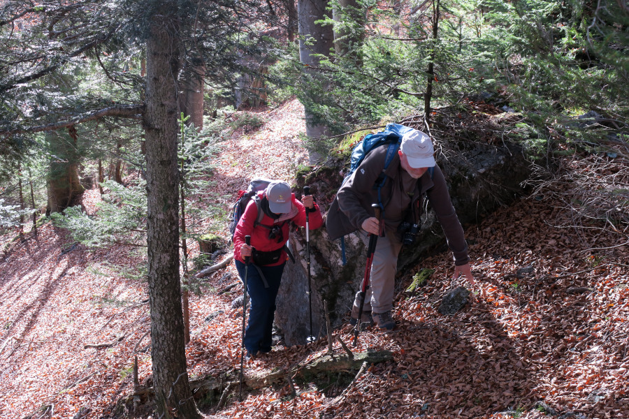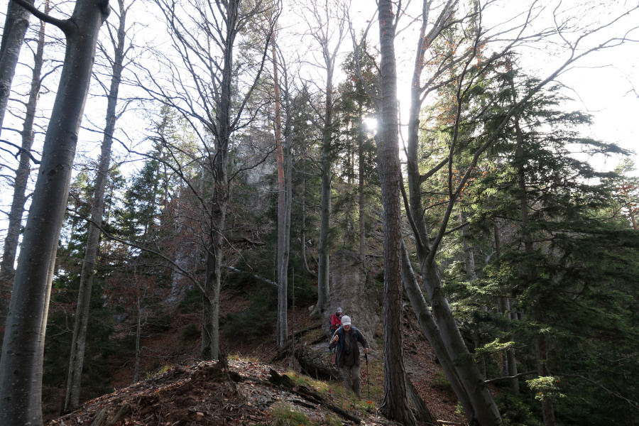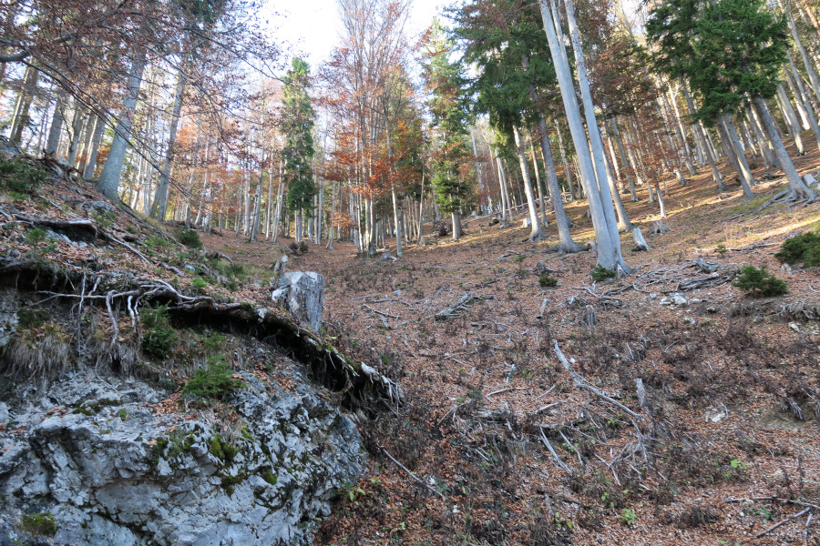 Der Abstieg war anfangs leicht – auf bequemen, nicht allzu rutschigen Waldboden am Südkamm hinab.
