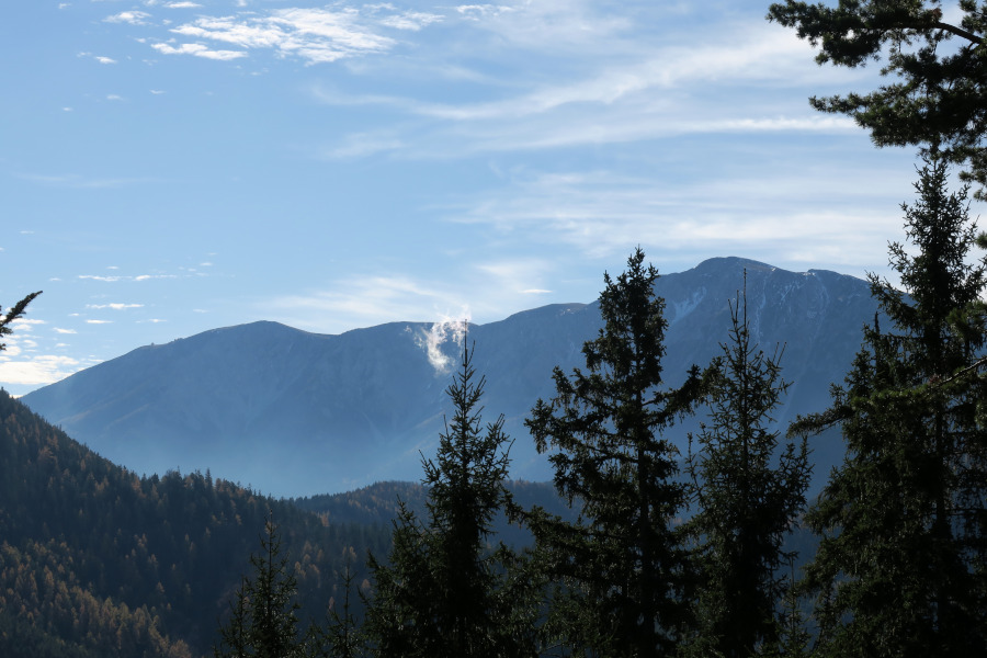 Etwas unterhalb des höchsten Punkts bot sich ein erster Blick zum Waxriegel und Kaiserstein. Über dem Puchberger Becken hielt sich eine sichtbare Dunstschicht, aus der immer wieder fractus (Wolkenfetzen) nach oben gesogen wurden. Möglicherweise eine Rotorströmung durch den aufkommenden Südföhn im Lee des Schneebergs. Kann natürlich auch thermisch unterstützt sein an den Südhängen der Dürren Leiten.