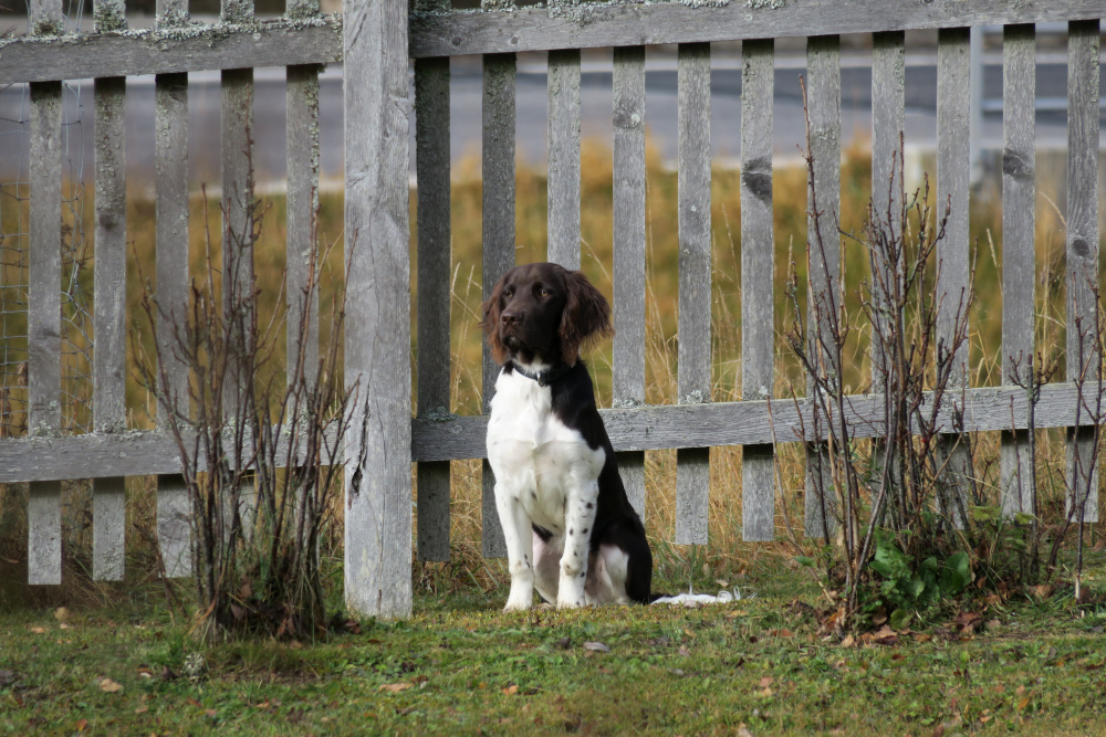 Der Hund beim Jagdhaus wollte uns verbellen, aber der Besitzer befahl ihm, damit aufzuhören. Also setzte er sich ein paar Meter entfernt an den Zaun und überwachte pflichtbewusst das Grundstück.
