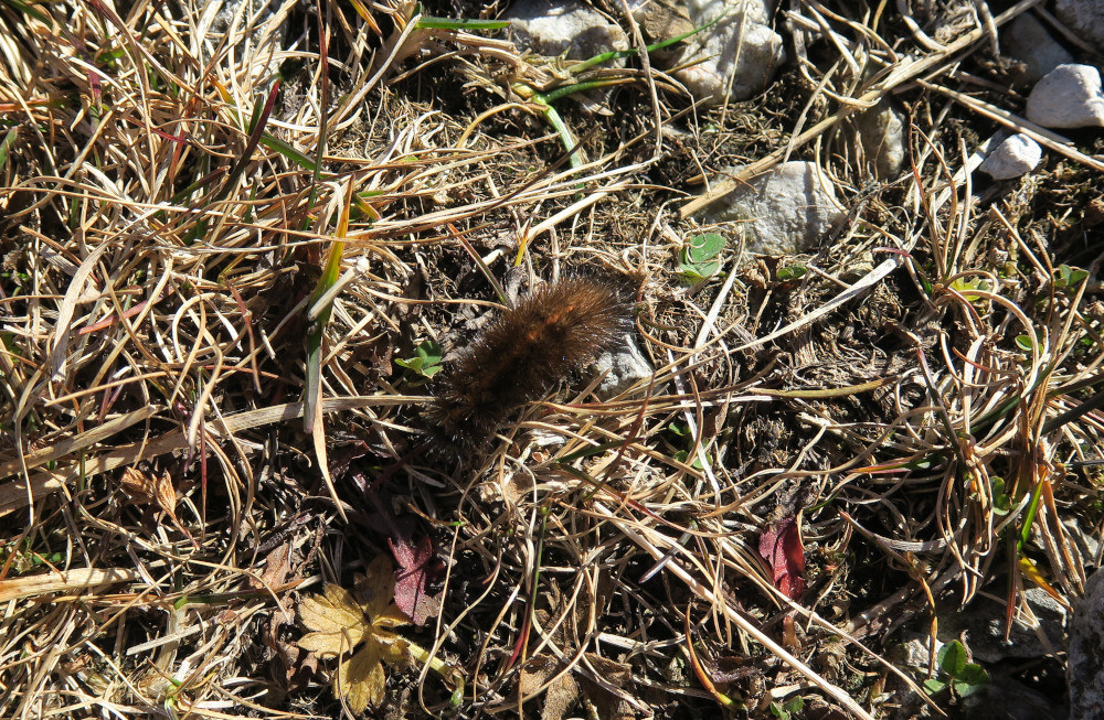 Kurze Unterbrechung der Fernsichtorgie durch eine Schmetterlingsraupe, die noch knapp fünf Tage Zeit hatte, bevor der nächste Kaltlufteinbruch kommen sollte. Es handelt sich wahrscheinlich um einen Bärenspinner, möglicherweise Breitflügeliger Fleckleibbär (Spilosoma lubricipedum), auch Weiße Tigermotte genannt. Um diese Jahreszeit eigentlich nicht mehr aktiv.