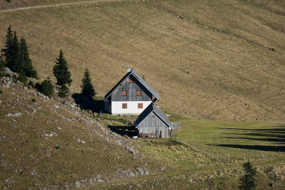 Vor über zehn Jahren rettete mich diese Alm, nachdem mir bei der Überschreitung der Donnerwand im Hochsommer das Wasser ausgegangen war. Dort stürzte ich einen Liter Frucade herunter und war im Anschluss wiederhergestellt. Dieses Mal war es zwar auch recht warm, aber nicht schwül, sondern sehr trocken bei leichtem Südwind und dadurch gut auszuhalten.