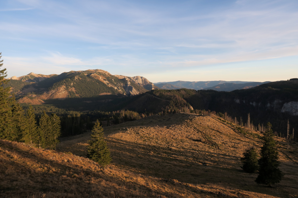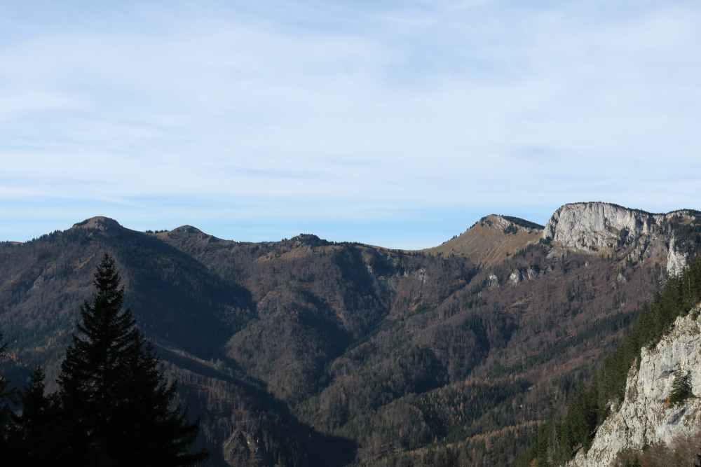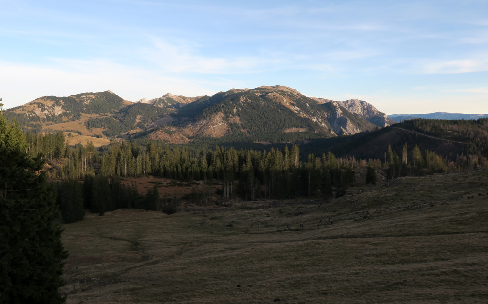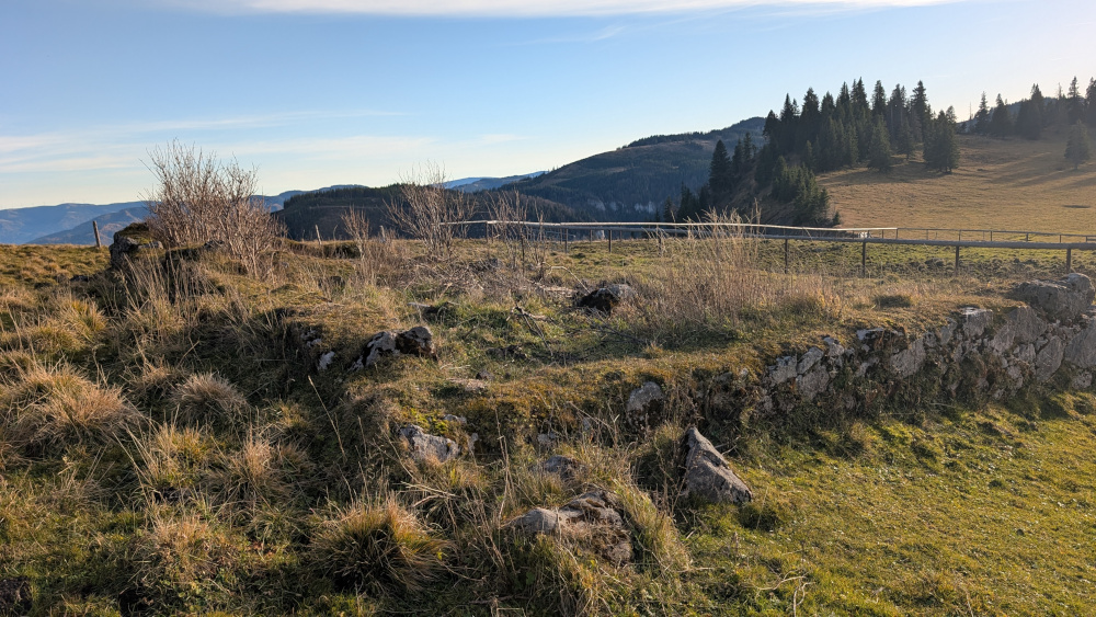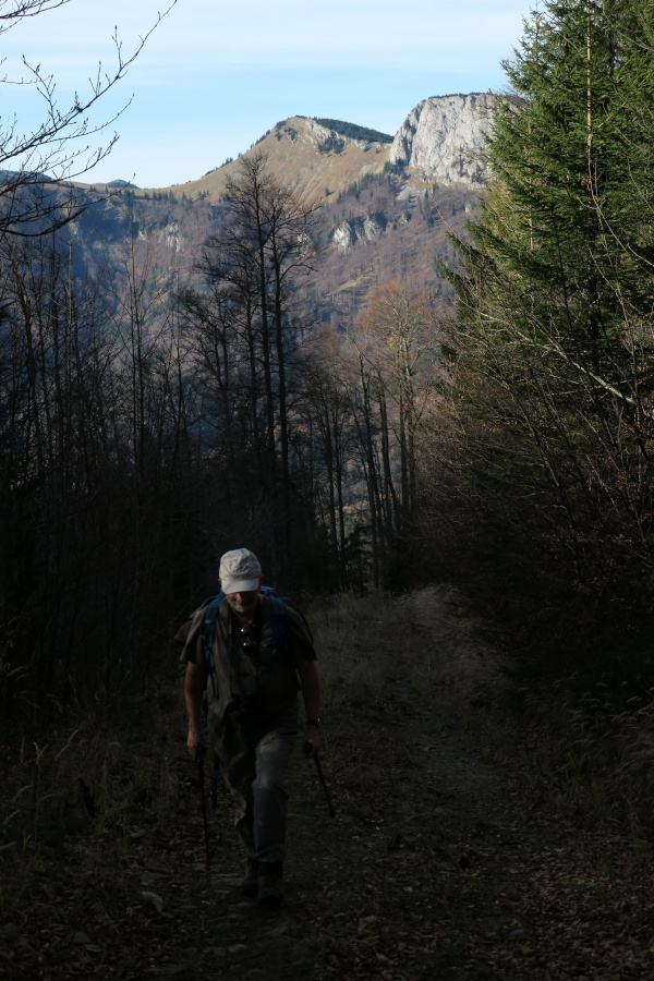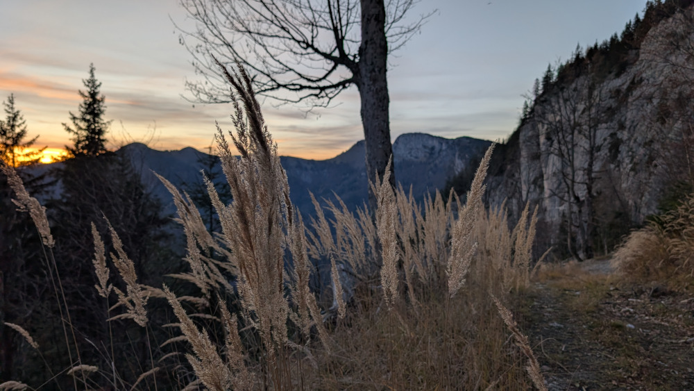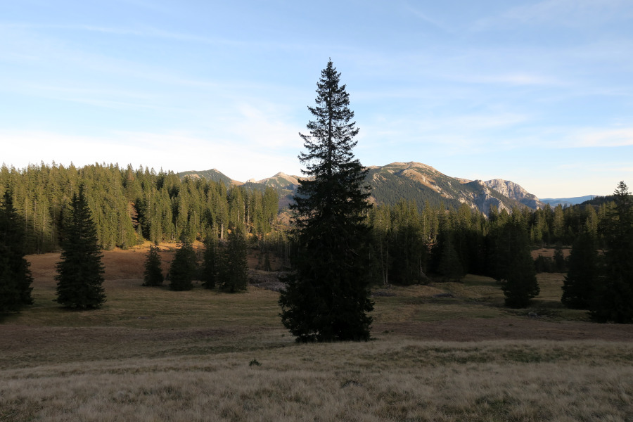 Als wir bei der Jagdhütte in den Oberen Alplgraben abstiegen – nur wenige Meter bergab zum Weg – wurde es bereits merklich kälter. Dazu wehte ein schwacher Rückenwind (katabatischer Wind). Der Weg bleibt dann aber oberhalb des Grabens, wo die milde Höhenluft sich halten konnte.