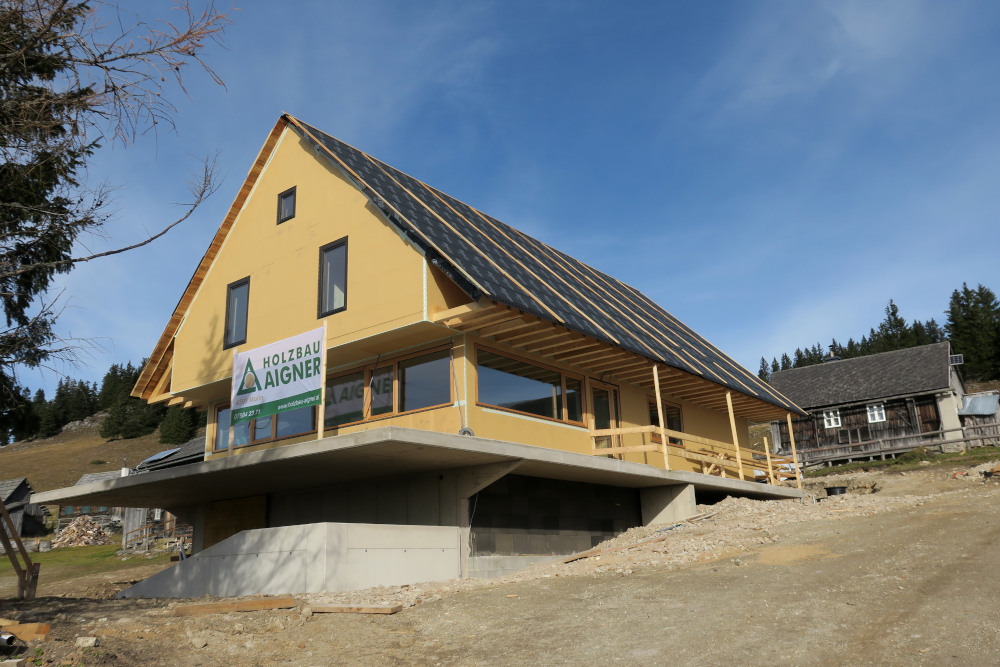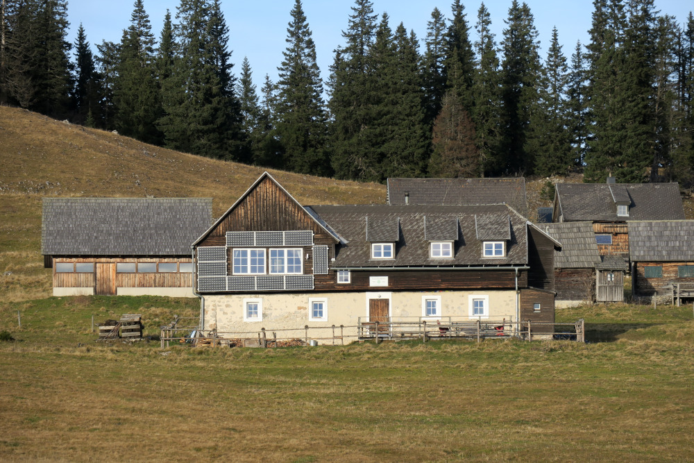 Bei der Hinteralm schauten wir uns zunächst den Neubau an, der die frühere Wiener Lehrer Hütte ersetzt (ÖAV), die seit 2010 nurmehr im Selbstversorgungsbetrieb fungierte und heuer im Juni abgebrochen wurde. Unweit davon brannte am 13. April 2025 zwei Nachbarhütten nieder.