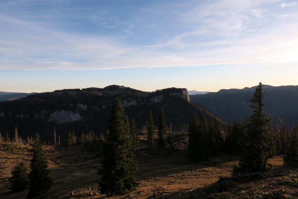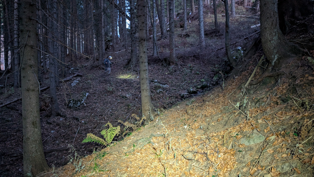 Zwar herrschte beim Einstieg in den Forstwegkehre abkürzenden Steig noch ein schwaches Dämmerlicht, aber im dichten Fichtenwald drang kaum noch Tageslicht durch. Nach langer Zeit also wieder einmal ein Abstieg mit Stirnlampe. Fast auf den Tag genau vor 14 Jahren sind Wolfgang und ich vom Kuhschneeberg ebenfalls länger in der Finsternis abgestiegen.