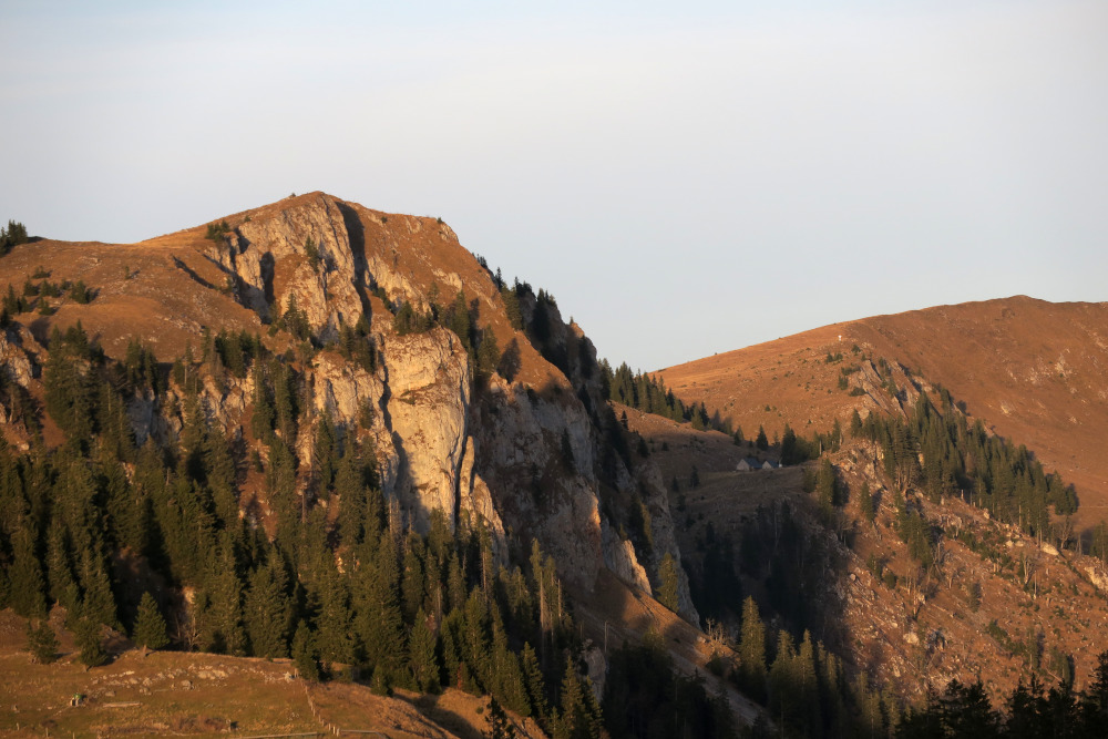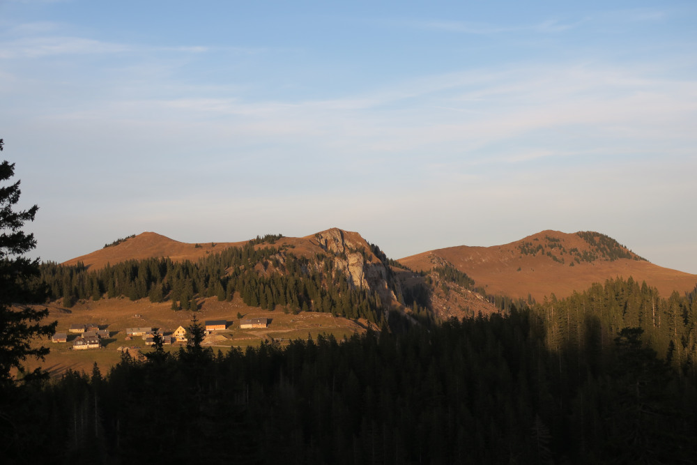 Der folgende Abstieg entlang der Weide zurück zur Jagdhütte war dann besonders schön im Abendlicht.