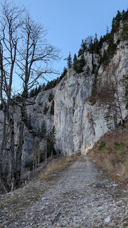 Nach einer kurzen Aufwärmphase bei Temperaturen knapp über Null, wo der Forstweg leicht ansteigend zur Bundesstraße verläuft, begann der markierte Steig, der die Forstwegverkehren mehrfach abkürzt. Die unteren Abschnitte lagen durchwegs im Schatten und waren etwas gatschig, im mittleren Teil verläuft der Steig teilweise im dichten Lärchen/Fichtenwald und war recht angenehm zu gehen. Mehrmals werden wasserführende Rinnen gequert. Im Aufstieg wurde es rasch wärmer und wir konnten auf das kurze Leiberl wechseln.